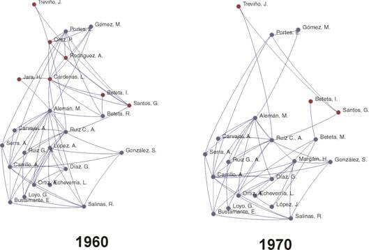 Los autores señalan que la red en que se incluyen todos los actores da información importante como la de “...las conexiones más importantes a lo largo del tiempo... “[2], como son las relaciones de Lázaro Cárdenas Del Río, Miguel Alemán Valdés y Hugo B. Margáin Gleason. Estos tres personajes están relacionados con 33 elementos de la red, incluyéndolos, o sea cubren un 89.19% y en el caso de incluir a Adolfo Ruiz Cortines cubrirían un 97.27% de la red. Hay que hacer notar que Adolfo Ruiz Cortines estuvo vinculado a Lázaro Cárdenas del Río y a Miguel Alemán Valdés, con el que no tuvo una vinculación directa fue con Hugo B. Margáin Gleason. Los cuatro personajes cubren 55 de los 143 vínculos establecidos.
