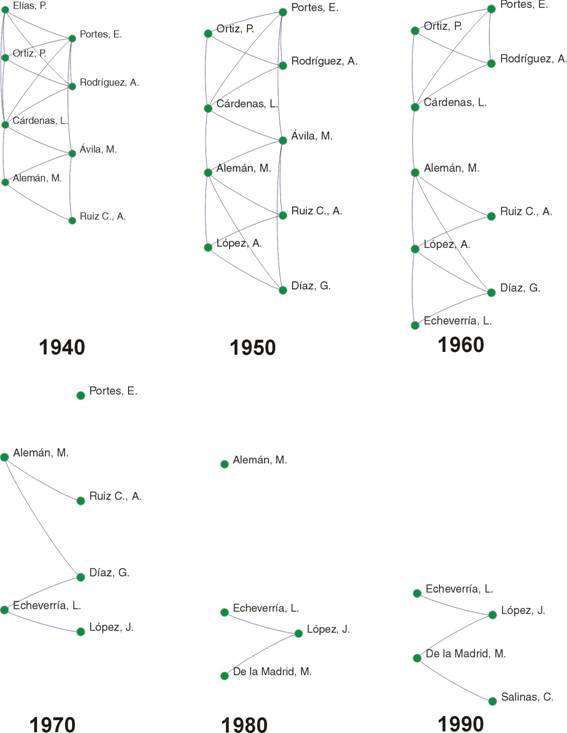 Our interest is to analyse a network trough time, how new relationships, new actors, the exclusion of actors, the exclusion of relationships impact the network from one period to another. This paper is based in the work of Schmidt and Gil (2002), where they analyse 37 Mexican political actors from 1920 to 1990, we use Pajek in order to visualize the network in periods of ten years.