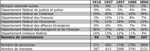 Tableau 1. Nombre de commissions par année et par Département (en % du total), nombre de personnes, nombre de mandats[6]. Sources : Base de données ElitesSuisse