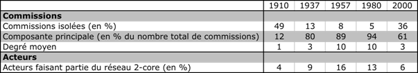 Cette analyse de densité s’est faite, pour les commissions, sur l’ensemble des liens recensés. Au contraire, pour les liens entre acteurs, nous avons opéré une sélection avant d'effectuer les calculs de densité. Ceux-ci concernent en effet le seul réseau 2m-core (ou 2m-slices), qui ne comprend que les liens de valeur 2 et plus (cf. de Nooy et al. 2005 : 109). En d’autres termes, un lien entre deux acteurs n’est recensé que si ces personnes siègent ensemble dans deux commissions différentes au minimum. Le réseau 2m-core permet en effet de négliger les liens entre deux personnes parce que celles-ci siègent dans la même commission. Ces liens « intracommissions » ne nous intéressent en effet pas dans le cadre de notre analyse qui porte essentiellement sur les liens « intercommissions ».