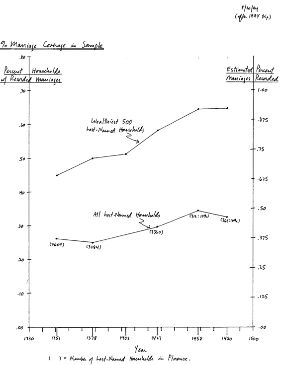 Los detalles del muestreo, codificación y fuentes de error serán enunciados en documentos futuros. De momento, digamos que se utilizó un muestreo por bola de nieve a través de múltiples viajes a los archivos. Dado el porcentaje de cobertura que se logró eventualmente, la crítica estadística habitual al muestreo por bola de nieve no tiene mucho sentido aquí. Como se muestra en la figura 1, que relaciona estos matrimonios a varios censos de impuestos de la población florentina total (que describimos más abajo), estimo que mi muestra de más de 10.000 cubre un 40% de todos los matrimonios que se llevaron a cabo entre las familias con apellidos. A causa principalmente de las fuentes, y en segundo lugar a la técnica de muestreo, el porcentaje de cobertura declina conforme el estatus social decrece. En la parte superior de la escala el porcentaje de cobertura para los 500 hogares más ricos de la ciudad crece de 65% al 90% a lo largo del tiempo, tal como se muestra en la figura 1.