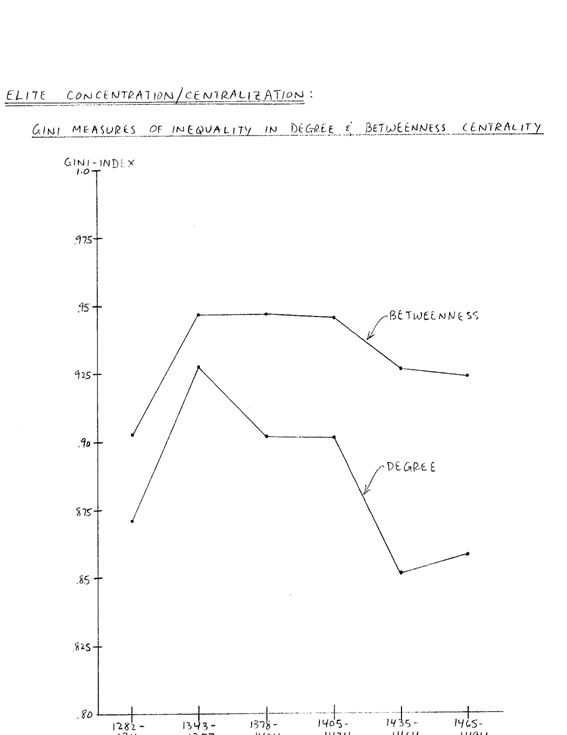 La brecha entre la curva del grado y la de la intermediación, en efecto, puede ser tomada como una medida de las presiones de la red de inter-matrimonios hacia la concentración de la élite, limpio de la dinámica de patrilineaje del tamaño de las familias. Esta presión que centraliza la red aumenta con el tiempo, con cambios notables en la función inmediatamente después de la rebelión Ciompi (1378) y después del comienzo del régimen Medici (1434). A pesar de la presión aumentada bajo los Medici para la concentración de la élite, las fuerzas demográficas no fueron totalmente contrarrestadas.
