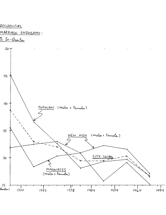 Entre las familias popolani, la endogamia residencial comenzó con un nivel inicial muy alto – 45% en el matrimonio durante 1282-1314. A lo largo del siglo catorce, sin embargo, continuó decreciendo, hasta que, en el siglo quince, el vecindario se volvió irrelevante para el matrimonio. Los popolani del siglo quince estaban muy mezclados y eran residencialmente homogéneos. Las familias de Magnates experimentaron un declive agudo y precipitado en el matrimonio intra- barrio muy temprano en el tiempo – de 1282-1314 a 1315-1342. Después de ello, las diferencias residenciales entre las clases de Magnates eran irrelevantes.
