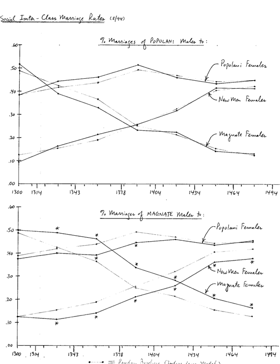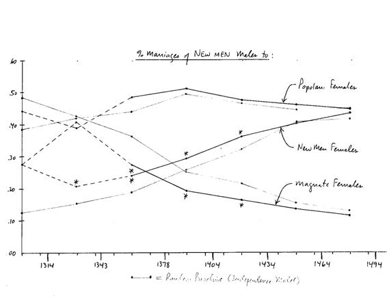 Los datos son más específicos en ésto. La endogamia magnate fue lograda principalmente a costa de unas frecuencias de matriminoio más bajas con los “hombres nuevos” no con los popolani. Aunque es cierto que los hombres Magnates se resistieron a casarse con mujeres popolani de 1343 a 1400 (más o menos), antes de 1343 y después de 1400 los Magnates no discriminaban a los popolani (quienes, como hemos visto, en ningún momento los habían discriminado). La antipatía mutua era realmente entre los Magnates y los “hombres nuevos”. [Este hallazgo estadístico es muy consistente con los relatos narrativos].