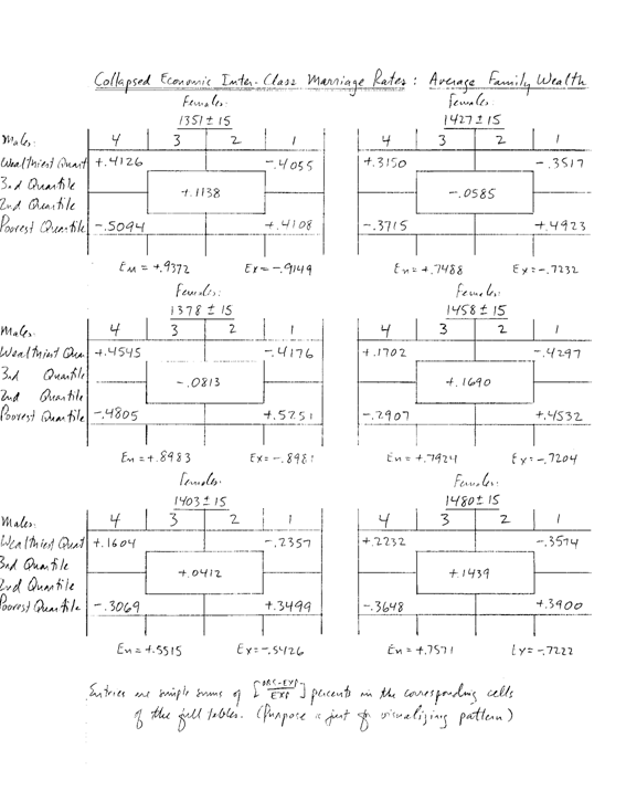 A pesar de las advertencias, los resultados (aproximados) sobre la endogamia de riqueza se presentan en la tabla 1. A causa de los temas recién discutidos, sólo me fijé en los cuartiles de riqueza, tratando, por lo tanto, únicamente como significativas las grandes diferencias en la riqueza media medida. Además reagrupé las 16 casillas de las tablas de 4x4 a 5 casillas, de acuerdo con el esquema mostrado en la tabla 1, para suavizar las fluctuaciones obvias de ruidos (que presumiblemente no aparecerían con datos más limpios).
