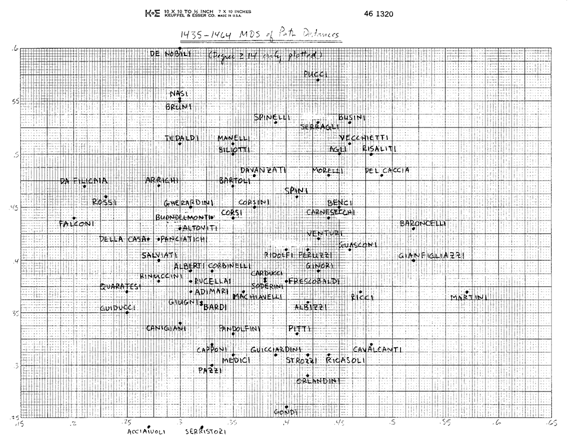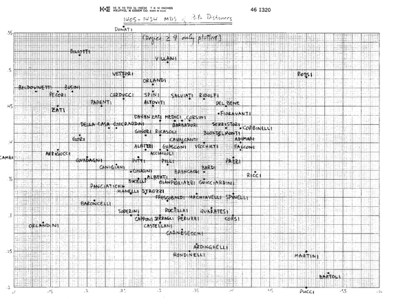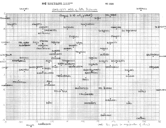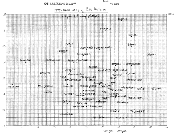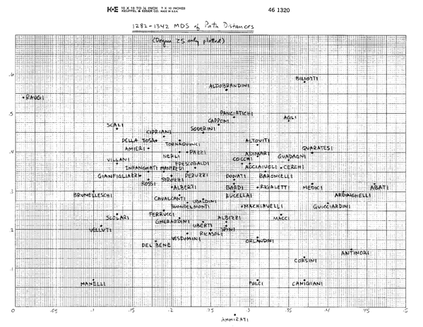 Finalmente, en un apéndice, presento una serie de gráficos de escalado bidimensional, para cada período del tiempo, de las distancias relativas de matrimonios entre las familias más importantes. (Una “distancia del camino entre familias” aquí es simplemente el número más corto de matrimonios encadenados necesarios para “alcanzar” unas a otras). Cuando se ven como una serie, estos gráficos dan una “imagen móvil” de cómo cambiaba la estructura de la élite a lo largo del tiempo, como se ve con una perspectiva de “ojo de pájaro” mirando abajo hacia la estructura. [De forma contrastada con, por ejemplo, la mirada “lateral” de la centralidad, que mira a la pendiente (cambiante) relativa de la “montaña”].