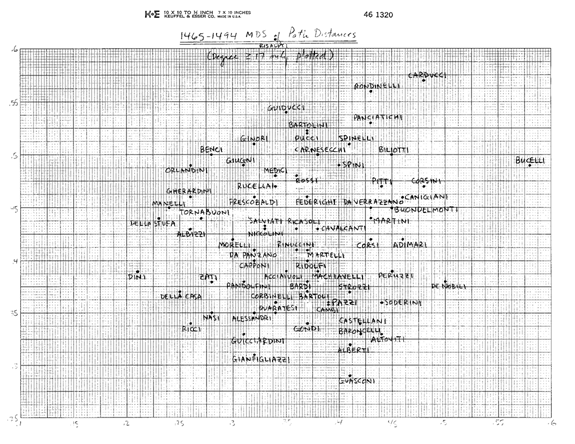 Las redes económicas no figuran en este documento, pero mencionaré brevemente dos bases de datos que han sido reunidas hasta ahora. Un estudiante mío avanzado, Paul McLean, ha codificado y digitalizado desde el catasto de impuestos de 1427 (esencialmente I.R.S- tipo devolución de impuestos) unas 14.000 relaciones de deuda – es decir, quien debe dinero a quién, por qué tipo de transacción anterior. Esta codificación diacrónica fue realizada en su primera oleada en la Universidad de Chicago, utilizando una copia microfilmada depositada allí por el David Herlihy tardío, y en oleadas posteriores por Paul en el Archivio di Stato, para suplir lagunas en el microfilm.