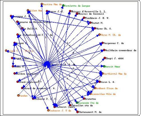 Le renouveau de l’approche biographique, l’intérêt pour les manifestations de la singularité porté par la micro-storia, ainsi que l’affirmation de la nécessité d’un « retour de l’événement » expliquent – avec un décalage de quelques années – les initiatives de traitement informatique et de représentation graphique des réseaux personnels par certains historiens, inspirés par la sociologie, dans les années 1990[12]. Ces démarches relèvent d’« analyses égocentrées », parce qu’elles partent d’un individu pour déterminer les relations qu’il entretient avec d’autres personnes (Lemercier 2005: 91-92). L’initiative en revient à certains historiens modernistes, spécialistes de la « République des Lettres », qui ont créé un logiciel nommé Arcane, conçu au départ pour éditer des correspondances, des entretiens, des mémoires et des journaux intimes ou de voyage, sources qualifiées d’ « ego-documents », c’est-à-dire des « écrits personnels qui éclairent les trajectoires individuelles »[13]. Ce logiciel est également une base de données, à la fois prosopographique et relationnelle, où plusieurs informations peuvent être renseignées dans des champs distincts, à partir de journaux intimes ou de correspondances entretenus par un individu précis[14]. Il permet ainsi de saisir l’identité des personnes rencontrées, le lieu et la date de l’interaction et le type de liens entretenus. À partir de cette saisie, le programme construit automatiquement le réseau personnel de l’individu et débouche sur une visualisation de toutes ses relations sociales en un temps et un lieu donnés, tout au moins telles qu’elles peuvent être représentées graphiquement à partir des sources traitées. Le logiciel représente aussi la nature, la réciprocité et l’intensité de ces liens sociaux par l’épaisseur et le sens des traits de flèche (Figure 1).