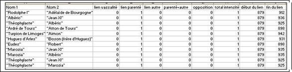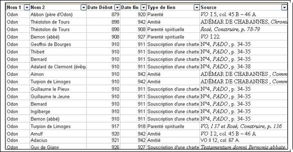 À partir de ce corpus, il a fallu mettre au point une base de données des liens d’Odon avec l’aristocratie de son époque. Chaque attestation de relation ou d’interaction entre deux personnes fait l’objet d’une entrée dans un tableau réalisé au format Excel (Table 1). La base de données fonctionne ainsi comme un répertoire de liens entre deux personnes précises (« Nom 1 » et « Nom 2 »). Ces liens sont datés précisément (« Date de début » et « Date de fin »), caractérisés par leur nature (« Type de lien ») et leur source est indiquée. La constitution de la base s’est déroulée en deux phases, en partant d’abord des documents où Odon apparaît. La saisie a ensuite été élargie aux sources où l’abbé de Cluny est absent, mais où sont attestées des personnes qui sont en contact direct avec lui, dans le but d’identifier des milieux où se trouvent des intermédiaires potentiels qui lui permettent d’avoir accès à de nouveaux espaces relationnels.