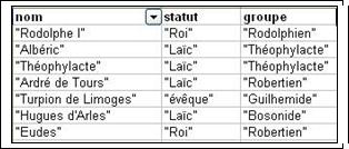 À l’issue de ce travail d’inventaire, on aboutit à une somme d’interactions entre des personnes, qu’il s’agit de coder afin de l’exploiter sous la forme de graphes et de la soumettre à des calculs simples, grâce au logiciel Netdraw. Le codage des données a été fait au préalable sous format Excel, en commençant par une feuille concernant les personnes (les « nœuds », en anglais nodes) et leurs attributs (Table 2): pour chaque nœud, identifié par son nom, on a distingué d’une part la fonction sociale exercée (moine, laïc, roi, évêque, chanoine, pape) et d’autre part le groupe (ou milieu) aristocratique élargi auquel appartient la personne (Robertiens, Guilhemides, Bosonides, Théophylactes, Rodolphiens, Richardides et autre)[30].