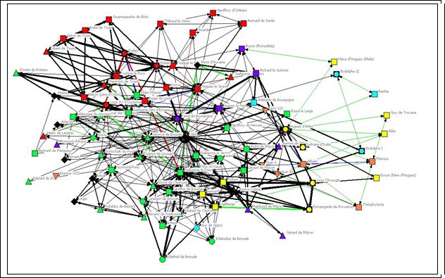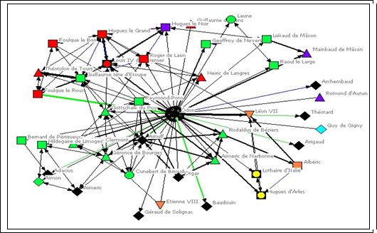 [59] Pour la « centralité de degré » : 1) Odon (41), 2) Hugues le Grand (14), 3) Guillaume Tête d’Étoupe (14), 4) L’évêque Gottschalk du Puy, 5) Raymond Pons, 6) L’abbé Arnulf, 7) Louis IV d’Outremer. Pour la « centralité de proximité » : 1) Odon (139), 2) Guillaume Tête d’Étoupe (172), 3) Hugues le Grand (175), 4) Hugues le Noir (176), 5) Roger de Laon (178), 6) Louis IV d’Outremer (180), 7) Raymond Pons (181). Pour la « centralité d’intermédiarité » : 1) Odon (1254, 454), 2) Hugues d’Arles (187, 833), 3) Hugues le Grand (135, 988), 4) Hugues le Noir (86, 847), 5) Raoul de Bourgogne (85, 828), 6) Guillaume Tête d’Étoupe (82, 261), 7) Albéric (75, 333).