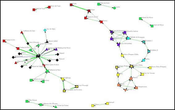 Ce premier graphe est difficilement lisible, mais on peut tout de même souligner que les ensembles aristocratiques (distingués par des couleurs) semblent fortement reliés entre eux par des liens ponctuels, quelle que soit la fonction des personnes interconnectées (distinguée par les formes). Cela signifie que les réseaux se concrétisent d’abord entre personnes appartenant à un même entourage nobiliaire, composé indifféremment de laïcs et de clercs. On remarque aussi que le réseau d’Odon est beaucoup moins dense sur la droite, que les quelques liens que l’on y repère relèvent essentiellement de la parenté et que les nœuds appartiennent aux milieux rodolphien, bosonide et théophylacte. Cette faible densité s’explique de trois manières. Sur le plan documentaire tout d’abord, on ne dispose d’aucune charte, ou presque, pour les Théophylactes, tandis que les corpus sont restreints pour les premiers Rodolphiens. Ces neuf nœuds périphériques représentent en outre, pour quatre d’entre eux, des femmes (« Nièce d’Hugues d’Arles », Berthe, Alda et Marozia). Cela ne signifie pas que le rôle des femmes dans les réseaux n’est pas important (bien au contraire, ce sont elles qui permettent en particulier d’étendre les parentèles par les mariages), mais elles apparaissent beaucoup plus rarement que les hommes dans les actes de la pratique. Cette donnée structurelle n’empêche pas certaines femmes de jouer un rôle important dans le réseau d’Odon, notamment lorsqu’elles sont reines ou comtesses et qu’elles sont étroitement associées au pouvoir et aux décisions de leur mari (la robertienne Emma, épouse de Raoul de Bourgogne, la bosonide Ingilberge, épouse du duc d’Aquitaine Guillaume) et quand elles sont veuves, notamment dans les cas de régence (la bosonide Ermengarde, veuve de Boson et mère du futur roi de Provence Louis l’Aveugle, la rodolphienne Adélaïde, veuve de Richard le Justicier)[37]. En dernier lieu, ces nœuds ont été actifs principalement dans les périphéries géographiques de l’itinéraire biographique d’Odon, qui a mené la majeure partie de son existence dans le royaume des Francs de l’Ouest : l’Italie[38], où l’abbé de Cluny se rend ponctuellement à partir de 927 et, surtout, le royaume de Bourgogne jurane dans lequel il ne semble avoir été qu’une fois.