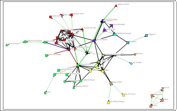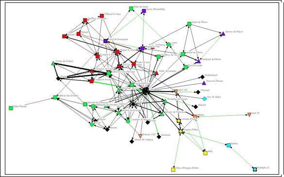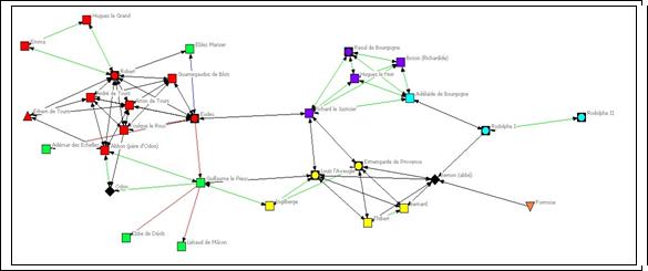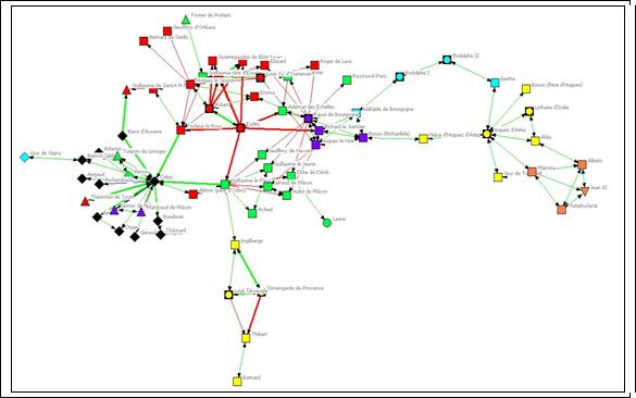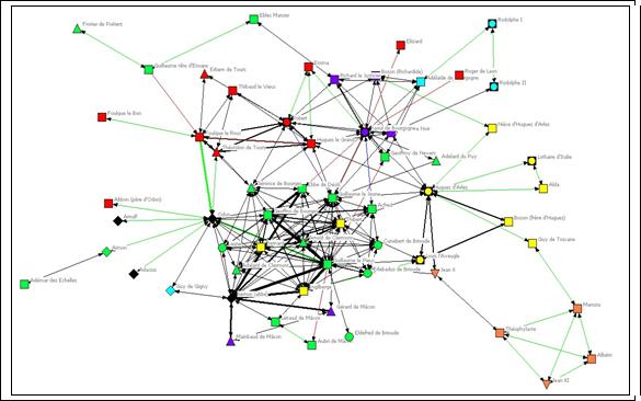 Donner de tels attributs peut sembler problématique, parce qu’ils figent l’identité des personnes et ne tiennent pas compte des changements de statut ou du passage dans un autre groupe aristocratique, à l’occasion d’un mariage par exemple. Bien qu’il soit possible, sur le plan technique, d’intégrer ces évolutions, elles n’ont pas été prises en compte ici parce que, du fait des homonymies fréquentes, elles rendent plus complexe encore la lisibilité et l’interprétation des graphes[31]. Du point de vue du statut, j’ai ainsi considéré la situation finale de chaque individu, même s’ils sont presque tous passés par au moins deux états différents – et plus, dans le cas des carrières ecclésiastiques –, tandis que j’ai saisi le groupe aristocratique initial, c’est-à-dire le milieu d’origine. Ces deux types d’attributs ont pu être codés sous Netdraw pour apparaître visuellement dans les graphes. Les statuts ont été représentés par des formes : losange pour les moines, cercle pour les chanoines, carré pour les laïcs, cercle dans un carré pour les rois, triangle pour les évêques et triangle inversé pour les papes. Les groupes familiaux ont été représentés par des couleurs : Robertiens en rouge, Guilhemides en vert, Bosonides en jaune, Théophylactes en orange, Rodolphiens en bleu clair, Richardides en mauve, autres (c’est-à-dire inconnus) en noir.