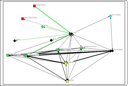 Lors de la première phase de sa vie, le réseau personnel d’Odon, est peu étoffé, mais on constate qu’il est assez rapidement relié à divers groupes aristocratiques, représentés par les différentes couleurs (Figure 5). Avant d’entrer dans le détail de la genèse de ce réseau au cours de cette première période, on peut en souligner certaines caractéristiques, grâce aux fonctions et calculs que permet le logiciel Netdraw.