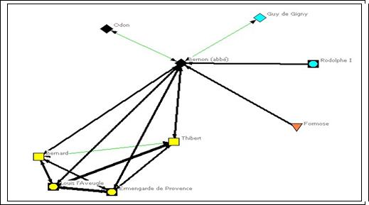 Les liens sociaux organisés autour de Guillaume sont importants car ils permettent vraisemblablement au jeune Odon d’accéder à un autre espace relationnel, celui des Bosonides de Provence. Le duc d’Aquitaine détient en effet un rôle d’intermédiaire majeur, ou plutôt de Cutpoint, notamment à partir des années 890 (soit au moment même où Odon est son nutritus), quand il épouse la fille de Boson, Ingilberge[49]. Le groupe bosonide est polarisé par Ermengarde, veuve de Boson, et surtout par son fils Louis l’Aveugle. Au cours des années 890, les membres de ce groupe familial tissent en outre des liens relativement denses avec un certain Bernon, abbé du monastère de Gigny dans le Jura. Parallèlement, ce dernier est en contact avec deux autres espaces relationnels : d’une part, celui du roi de Bourgogne Jurane, Rodophe Ier, alliés par des liens de parenté avec la famille des Richardides ; d’autre part, les milieux pontificaux romains, représentés par le pape Formose.