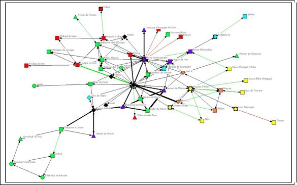 [53] « Centralité de degré » : 1) Guillaume le Pieux (21), 2) Guillaume le Jeune (19), 3) Thibert (17), 4) Bernon (16), 5) Raoul de Bourgogne (15), 6) Odon (15), 7) Ingilberge (15). « Centralité de proximité » : 1) Guillaume le Pieux (181), 2) Guillaume le Jeune (175), 3) Raoul de Bourgogne (187), 4) Thibert (188), 5) Hugues d’Arles (189), 6) Odon (189), 7) Hugues le Grand (191). « Centralité d’intermédiarité » : 1) Hugues d’Arles (376, 964), 2) Odon (371, 309), 3) Guillaume le Pieux (326, 626), 4) Guillaume le Jeune (321, 706), 5) Raoul de Bourgogne (260, 16), 6) Foulque le Roux (203, 514), 7) Jean X (155, 817).
