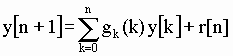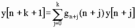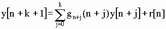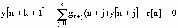 donde se ve claramente el orden de la ecuación. Los g[i] y r[n] son los coeficientes no constantes, determinando el último la inhomogeneidad de la ecuación. El término r[n] es llamado término de forzamiento, fuerza externa, control o entrada ("input") del sistema, ya que se corresponde, en la mayoría de los problemas físicos, con una fuerza externa que obliga al sistema a comportarse de una forma determinada. Para encontrar la solución necesitamos de k valores que fijen las condiciones iniciales del problema. La ecuación homogénea asociada, a la que no imponemos condiciones iniciales, será