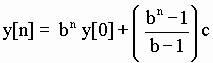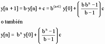Para conseguir un método abreviado, podemos optar por otro procedimiento, en un intento de utilizar el método del polinomio característico (método del anulador), descrito para la solución de la ecuación homogénea. Sin embargo, primeramente vamos a describir una forma sencilla, sólo útil para las ecuaciones inhomogéneas en coeficientes constantes. Si pudiéramos reducir la ecuación inhomogénea que nos ocupa a una ecuación homogénea, de la que sabemos encontrar la solución por el método del polinomio característico, habríamos resuelto el problema. De esa forma, la solución más general de la ecuación anterior sería la solución general de una ecuación homogénea a la que hemos obligado a obedecer la condición inicial. Transformemos la ecuación en una nueva, redefiniendo los estados en esta forma yp[n] = F y[n] + G c El siguiente estado será yp[n+1] = F y[n+1] + G c De las expresiones anteriores encontramos (yp[n+1] G c) F-1 = y[n+1] (yp[n] G c) F-1 = y[n] Las constantes F y G se determinan de forma que la ecuación resultante para yp[n] sea homogénea. Sustituyendo los valores anteriores en la ecuación inhomogénea de partida, encontramos F = G (b 1) Y la solución de la ecuación resultante yp[n+1] b yp[n] = 0 puede encontrarse por el método del anulador del polinomio característico (E b I) yp[n] = 0 Es decir yp[n] = E yp[n-1] = En yp[0] = bn yp[0] Ahora debemos identificar las condiciones iniciales de yp[n] en función de las de y[n]. De la transformación yp[0] = F y[0] + G c obtenemos yp[n] = bn (F y[0] + G c) donde, sustituyendo el valor de yp[n], resulta F y[n] + G c = bn (F y[0] + G c) y[n] = bn ( y[0] + c G/F) c G/F De las condiciones sobre F y G determinamos la solución final de la ecuación en diferencias inhomogénea motivo de estudio que coincide exactamente con la encontrada por el método de la recurrencia. Volver al principio del apartado Volver al principio del artículo Volver al principio4.3. Uso del método del anulador o polinomio característico para ecuaciones inhomogéneasObservemos que la ecuación puede ser escrita de la forma: (E b I) y[n] c = 0 En ella, tomando el anulador de la ecuación homogénea (E1 b I) yh[n] = 0 obtendríamos sus soluciones. En este caso E1 = b I equivalentemente yh[n] = A bn con A una constante arbitraria. Nos faltaría ahora encontrar una solución particular de la ecuación completa. Tengamos en cuenta que el operador diferencia actuando sobre una constante es cero, es decir: D c = 0 De la definición de operador cambio, E = (D + I): E c = c ; (E - I) c = 0 Es decir, el anulador de c es (E - I). Consecuentemente, la ecuación (E b I) y[n] c = 0 tiene una solución en términos de anuladores, consistente en encontrar el anulador de c, que llamaremos E2 y verifica (E2 I) (E b I) yp[n] = 0 = (E2 I) c siendo yp[n] una solución particular de la ecuación inhomogénea completa. La ecuación para yp[n] tiene dos soluciones, una usando el anulador (E b I) y la otra usando (E2 I), que son respectivamente, en términos del polinomio característico E = b I y E2 = 1 I es decir, yp1[n] = bn e yp2[n] = 1n Pero aquí debemos tener en cuenta que la solución de las ecuaciones inhomogéneas la buscamos como suma de la ecuación general de la homogénea asociada y una solución particular de la inhomogénea completa. Con ello queremos indicar que la solución que obtengamos haciendo uso del polinomio (E b I) = 0 es una solución de la ecuación homogénea, ya incluida en la resolución correspondiente de la ecuación asociada. Usar el anterior anulador nos proporcionaría una redundancia innecesaria. Así pues, sólo es necesario determinar la solución del polinomio (E2 I) = 0 Notemos que, en términos de operadores, la ecuación inhomogénea de partida se escribe como [Polinomio de E] x y[n] = c y la solución particular se encuentra como el anulador de c, es decir [anulador c] x [polinomio de E] = 0 Consecuentemente la solución será la suma de la solución general correspondiente a la ecuación homogénea más la solución particular de la inhomogénea completa, encontrada utilizando el anulador precedente E2 = I que, en este caso, indica una solución yp2[n] = constante arbitraria = B Así pues la solución buscada será: y[n] = yh[n] + yp2[n] = A bn + B siendo A y B dos constantes arbitrarias, a determinar por medio de la propia ecuación y de la condición inicial. Sustituyendo esta solución en la ecuación original y[n+1] - b·y[n] = c o en forma equivalente (E1 b I) y[n] = c es decir, (E1 b I) (A bn + B) = c Recordemos que la solución A bn lo es de la ecuación homogénea, luego la aplicación del anulador al primer término es cero. Por tanto, obtenemos (E1 b I) B = c Como el operador salto actuando sobre una constante la deja invariante, resulta B b B = c => B = c/(1-b) Utilicemos ahora la condición inicial que, en términos de la solución encontrada, será y[0] = A + c/(1-b) para obtener el valor de A A = y[0] c/(1-b) = y[0] + c/(b-1) Luego la solución se escribirá y[n] = y[0] bn - c bn/(1-b) + c/(1-b) = Nótese que esta solución coincide exactamente con las encontradas por el método de la recurrencia y de la reducción a una homogénea. Debemos tener cuidado con la redundancia posible en soluciones de la ecuación homogénea asociada al buscar las soluciones particulares. Volver al principio del apartado Volver al principio del artículo Volver al principio5. Ecuaciones de orden superior con coeficientes constantesPara abordar este apartado resolveremos unas ecuaciones prototipo que nos servirán de base: