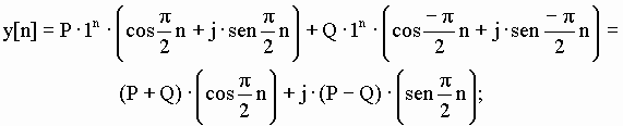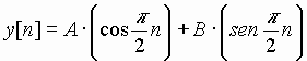 Si la reescribimos en función del operador de desplazamiento, resulta: (E2 + 1I)y[n] = 0 Podemos obtener el polinomio característico y sus correspondientes raíces (en este caso pertenecientes al cuerpo de los números complejos e imaginarias puras): P(r) = r2 + 1 = 0 Así la solución de esta ecuación homogénea es: y[n] = P j n + Q (-j)n si aplicamos las reglas de Euler será: