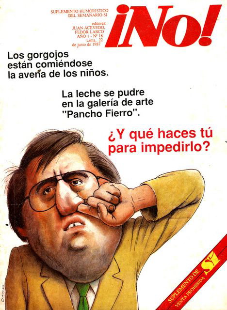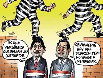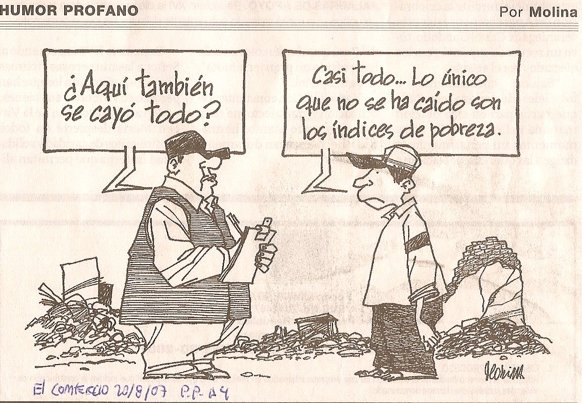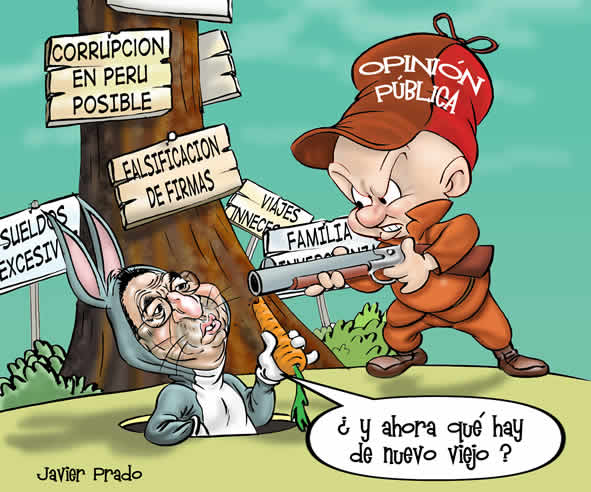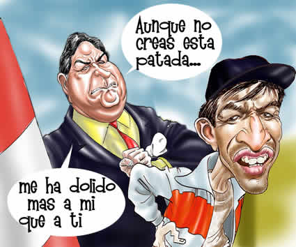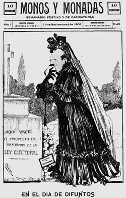 “La risa, remedio infalible…” "no concibo un humor político que sea La caricatura de tinte político en el Perú tiene una larga historia y ha sido, por así decirlo, una de las “armas” editoriales más eficaces contra dictadores y gobiernos totalitarios o corruptos, amén de otras yerbas de esta viña del Señor. Gracias a la caricatura política, un género de expresión muy antiguo, los artistas gráficos del periodismo escrito pueden explayarse sin temor a la censura, salvo en algunos casos de excesiva presión extra-periodística ejercida desde afuera. Cuando en 2004 se cumplieron los primeros 100 años de la primera edición de la revista cómica “Monos y Monadas”, la decana en el arte de hacer crítica social con colores, lápiz y el carboncillo en el Perú, se tiró la casa por la ventana, y con mayor razón porque últimamente el género caricaturista ha cobrado un singular impulso en nuestro medio, gracias a las nuevas técnicas para plasmar sobre el papel, con trazos ágiles, el sentir y la diatriba y la burla y la protesta, que sino la crítica y la condena solapada, sobre hechos y personajes de la vida pública nacional. En este contexto, la absurdez de la política peruana, con sus hierbas y otras pajas, ha sido representada desde siempre con la punzante ironía del humor negro (y gris y de no sabemos con cual otro colorinche) de los grandes dibujantes de todas las épocas. Acá la caricatura es toda una tradición, y la “cachita” 1 viene con pluma y con ingenio, por así decirlo; y así se burlan de los politicastros de turno que para fortuna o infortunio de los paisanos de a pié, se suben (o los suben) al columpio del poder elegidos por voluntad o sin voluntad ciudadana. Se mofan también del pelotero figuretti, del patán hijo del presidente, del funcionario público que se vende al mejor postor, del juez o jueza coimeros, del empresario sinvergüenza o abusivo, de las “leguleyadas” 2 de los abogados y jueces corruptos, del congresista petulante, del delincuente de saco y corbata, de las instituciones estatales que sirven a intereses creados del régimen de turno o de particulares, del farandulero de moda, de la inmoralidad de alto vuelo, de los alcaldes malversadores de fondos municipales, del poderoso que viola los derechos de los demás, de la sociedad fatua, de la mala administración pública, de las malas legislaciones, de la pésima justicia –en un país donde la “ley del embudo” 3 o la “ley de la selva”, es decir, donde manda el más fuerte, es algo cotidiano—; el trazo ágil del creativo se mofa también de los maltratos en la seguridad social o en cualquier otra entidad que preste servicio al ciudadano, de los sueldos de los burócratas. La caricatura política, que es la que nos ocupa aquí, es tal vez la más expresiva en nuestro medio, es la que a diario se mofa sutilmente de aquello que anda mal en el fuero público o de todo lo que podría estar mejor; son dibujos que muchas veces no están exentas de moraleja: la irreverencia punzo cortante forma parte de su stock humorístico. El caricaturista hace reír poniendo en ridículo las malas artes políticas y públicas de personajes que, supuestamente, están donde están para servir a la sociedad y no para servirse de ella, y lo hace con la corrosiva acidez y los recursos que le proporcionan su impresionante creatividad, dando vida a su mundo de colores encendidos –que sino en b/n—, exagerando rasgos, personalidades, atributos, comportamientos y cualidades de prójimos y prójimas de postín, tratando de resaltar lo malo y lo bueno, lo verdadero y lo falso, venteando los siete pecados capitales de esta sociedad en la que se revuelve la absurda contradicción humana. Para los estudiosos, una caricatura representa muchas cosas, es a la vez “caricaturizar” lo que no se nota a simple vista como también aquello que se nota, simbólicamente, a una realidad; es, en todo caso, una forma de llamar la atención, humorísticamente, sobre actitudes, comportamientos, circunstancias, hechos o acciones de personas o colectividades. De allí que se puede decir que el “modo” en que se muestra la actuación de un personaje, grupos de individuos o situaciones circunstanciales puede resultar “caricaturesco, a”, es decir, la exageración de ciertos rasgos de las peculiaridades humanas y sus acciones plasmada en el papel o en “vivo” –acto teatral o televisivo—. Pero la caricatura en el Perú ha seguido una trayectoria muy particular, a diferencia de otras manifestaciones artísticas similares; lo político, como ninguna otra forma de expresar el humor gráfico, manifiesta con agudeza la idiosincrasia perulera, que, como verá el amable lector, poco ha variado a lo largo del tiempo… las ideas, la actitud, el comportamiento, las formas de asumir los hechos, las motivaciones, los estilos y hasta los dobles discursos son gotas del mismo charco… y de la (bufo) comedia peruana… ______________________________ 1- Cachita. En el Perú esta voz es sinónimo de ironía (burla, mofa, desdén). Por eso se dice: “no me hagan cachita porque me amargo fuerte y nadie va a responder los golpes…” Diccionario de Argot Limeño o Jerga Criolla del Perú, de Guiullermo E. Bendezu Neyra, Editorial Universo, La Victoria, Lima, 1970 2- Leguleyada. Dícese de las argucias jurídicas ejecutadas por uno de esos representantes que tanto mal le hacen a la honra y buen nombre de los abogados. 3- Este término es una expresión acuñada popularmente para denunciar una injusticia surgida en alguna confrontación o disputa. El mandato único de esta ley puede resumirse en: "La ley del embudo/lo ancho para otros/lo estrecho para uno" (refrán), en referencia a la forma del embudo.