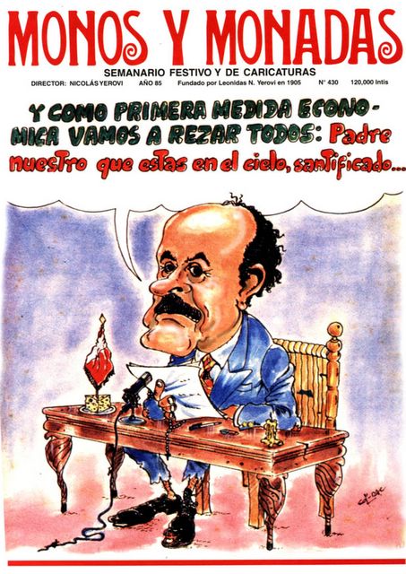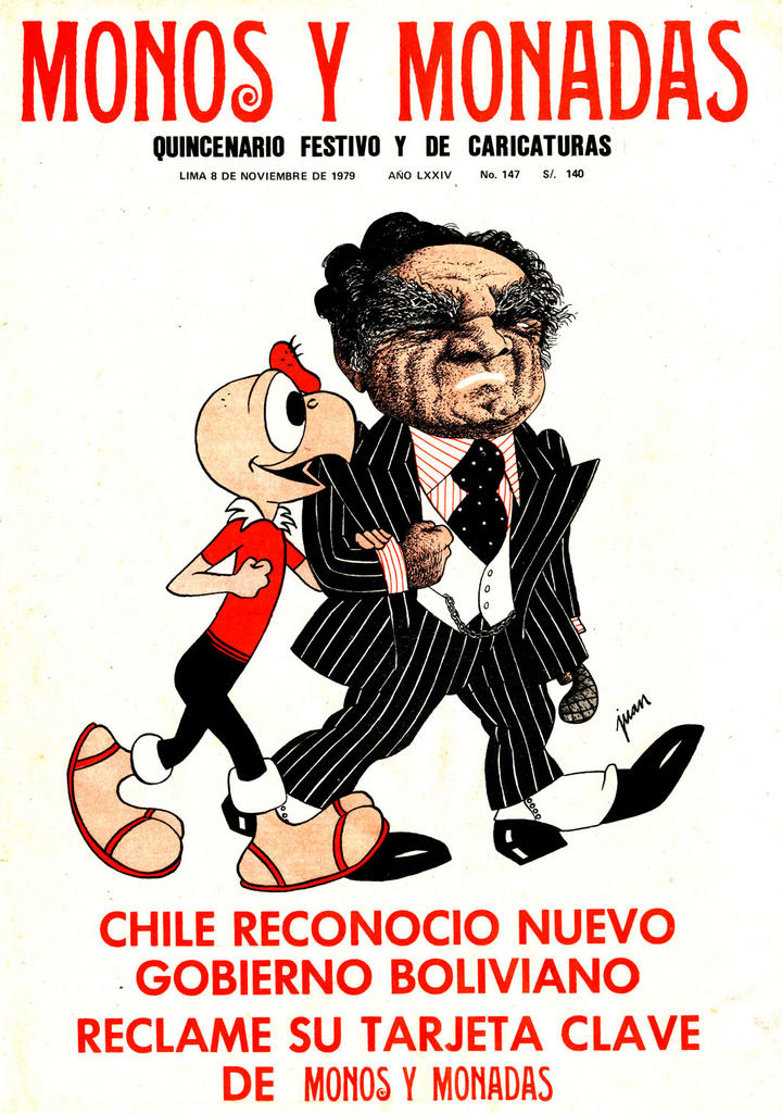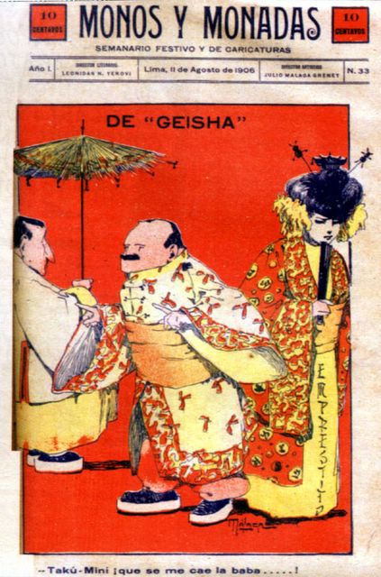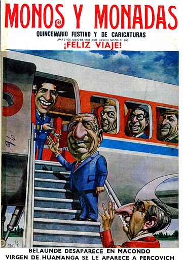 Fue una víctima más de la persecución política, no ya por parte de una dictadura aleve, sino por el lado de un gobierno supuestamente democrático (el de Alan García), que utilizó los sutiles hilos del poder para silenciarla. Pero la revista Monos y Monadas, como el Cid, todavía hace temblar a los rufianes de la política peruana, y a quienes hacen uso y abuso de un poder que se les da para servir a la sociedad, y no para aprovecharse de ella. Esta egregia publicación cómica fue, tal vez, la mejor creación del recordado poeta limeño Leónidas Yerovi (1881 - 1917), un intelectual de la generación de los 20s que un buen día no tuvo mejor idea que abrir una revista de humor, para burlarse de los políticos de su época, a los que detestaba, además de hacer una velada crítica social. Pero lo que nunca se imaginó el buen Leónidas era que su dilecto “hijo” iba a cumplir los cien años, un aniversario que fue objeto de reconocimiento no solo dentro del Perú. Monos y Monadas fue y es, qué duda cabe, la decana del humorismo político peruano, y no sin razón, a juzgar por su vigencia tan actual, llena de gracia y cundería, sus personajes desfilan por sus páginas amarillentas y coloridas, como los actores y actrices de la vida real, los protagonistas buenos y malos de nuestra historia republicana… allí están el generalito con sus galones y su sonrisa cínica, el ricachón con sombrero de copa, la damisela de copas, el dictador de turno con su corte de “ayayeros” 23, los parlamentarios de salón… nadie escapa a su mordacidad, y esto, tampoco los más singulares inquilinos de la vieja Lima: el canillita de la esquina, el bodeguero, el cantinero, la vendedora ambulante, los borrachitos de amanecida, el cura del barrio, el lechero, el mendigo, el provinciano recién bajado de la sierra, el sindicalista de postín, el hombre de negocios sin escrúpulos… para el ciudadano común esto suele ser una suerte de catarsis gráfica a sus frustraciones cotidianas, el hombre de la calle tantas veces desencantado por el “así es la vida”. En Monos y Monadas se puede recorrer prácticamente toda la historia del Perú del siglo pasado (S. XX). Para empezar, vamos a recorrer algunas las caricaturas de esta afamada publicación, cuyos dibujantes no hacen sino reflejar en papel el estado de ánimo del periodismo de turno ante las viscitudes de los personajes del alto (y no tan alto) plumero. (Nota de Redacción: se ha considerado conveniente colocar bajo algunas de las siguientes imágenes sus leyendas originales en cursiva)