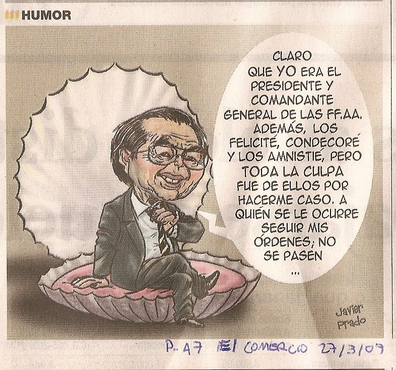 Heduardo: Yo creo que Alan no es un tipo corrompido, hubo una campaña terrible en su contra pero al final no se le probó gran cosa. Él está en ese grupo de personajes que quieren pasar a la historia como políticos, su ambición es política, quiere realizarse, quizá en algún momento ser el segundo Haya. Alfredo: Alan García es una persona que tiene muchos méritos personales, yo creo que ha cometido muchos errores, pero nadie puede ser condenado por errores. Molina: Alan no tiene chance, el pata tuvo su oportunidad. Tiene una presencia importante pero no le basta. ______________________________ 28- http://www.caretas.com.pe/2001/1662/articulos/humoristas.phtml (1/3/2010)