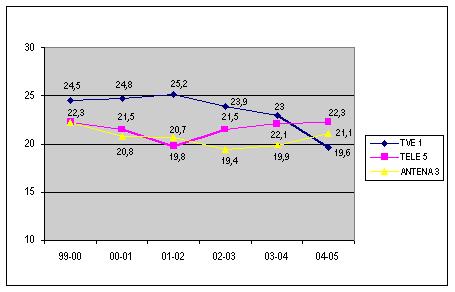 Fuente: Elaboración propia a partir de datos de GECA. 2) El liderato del mercado televisivo español pasa de manos de TVE 1 a Tele 5, vuelco que se produce en la temporada 2004-05 tal como se aprecia en el gráfico 1. Esta situación se mantendrá hasta 2009, cuando La 1 recupera la primera posición. Gráfico 1. Evolución del share de las principales cadenas entre las temporadas 1999-2000 y 2004-05 Fuente: Elaboración propia a partir de datos de GECA. 3) Se incrementa la oferta de contenidos audiovisuales en múltiples plataformas. En el año 2005, el Gobierno concede nuevas licencias de TDT, además de una licencia analógica. A esta oferta hay que añadir la disponible a través de otras vías de distribución como el cable, el satélite o el ADSL, y plataformas en auge como Internet y el teléfono móvil. En cuanto a los contenidos, a mediados de la década de los 90, los géneros de entretenimiento habían sido desplazados del prime time de los días laborales, dominado desde entonces por las series de ficción nacionales. Sin embargo, en el año 2000, el entretenimiento volvió a ser el protagonista de la parrilla televisiva como consecuencia del éxito de audiencia de un nuevo contenido televisivo. El reality game se extendió por todas las franjas en forma de programa independiente y como sección dentro de otros espacios.
