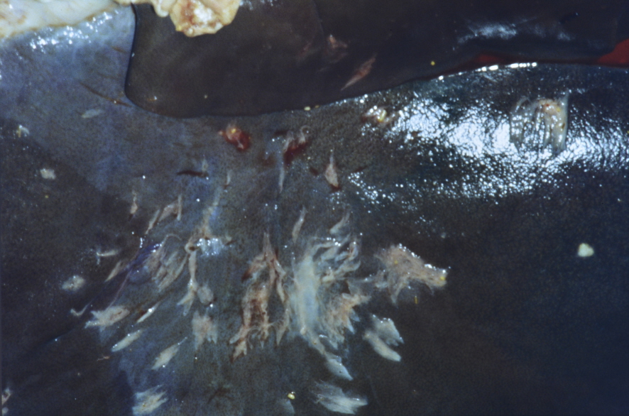 Caballo, hígado: calicosis (Strongylus vulgaris), con flecos de fibrina. DP pues esta lesión normalmente es generalizada 886x586, 302.8 KB |