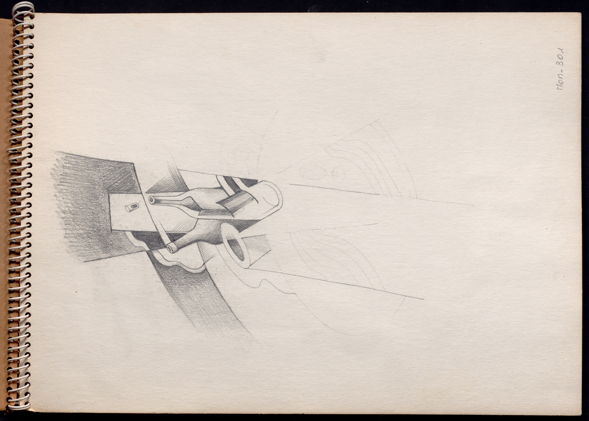 Bloc de dibuix de 23x32,5 cm. Conté 1 pàgina amb un dibuix a llapis a una cara i un dibuix fet amb plomí a l'altra cara, 1 pàgina amb un dibuix fet amb plomí i rotulador negre i 4 p. blanc.