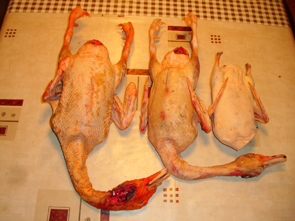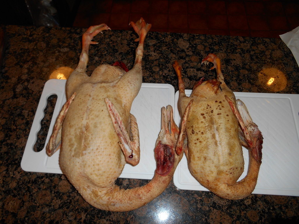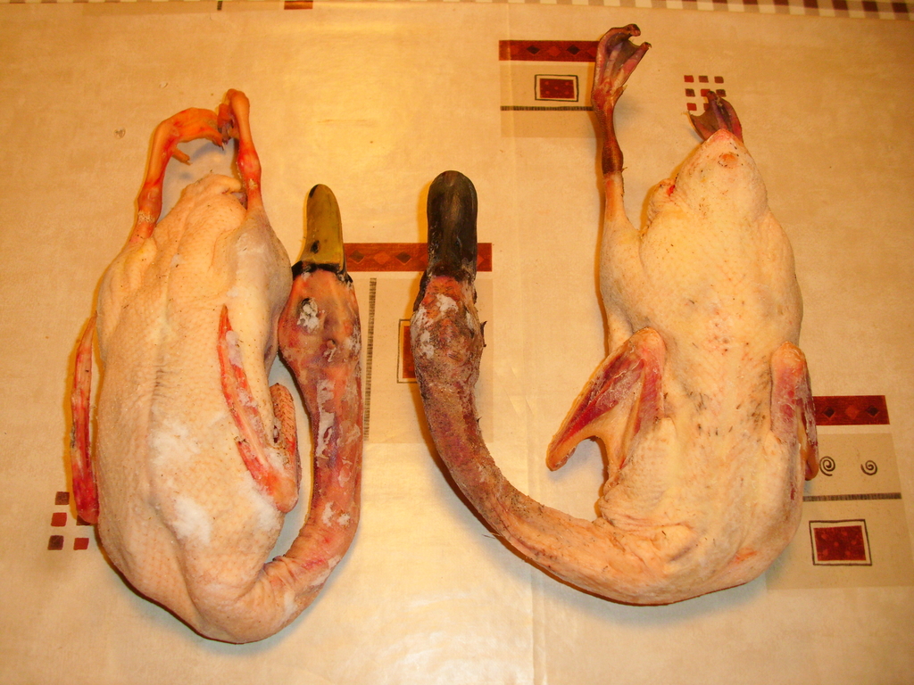 Canales patos silvestres criados: macho joven (pata color claro) y hembra vieja (pata color oscuro), ambos de 1,2 kg PC (excelentes para hacer a la brasa como ración) 1024x768, 725.2 KB |