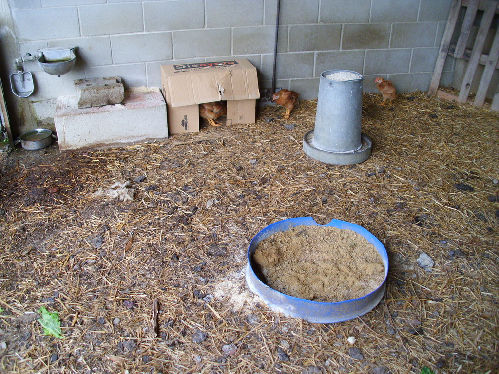 El mismo día de la compra, se deja la caja de transporte, para que duerman dentro. Se coloca arena para que los pollos se revuelquen y se desparasiten en ella y para que la ingieran, para que su molleja tenga piedrecillas y pueda triturar el cereal que se les de 1024x768, 918.0 KB |