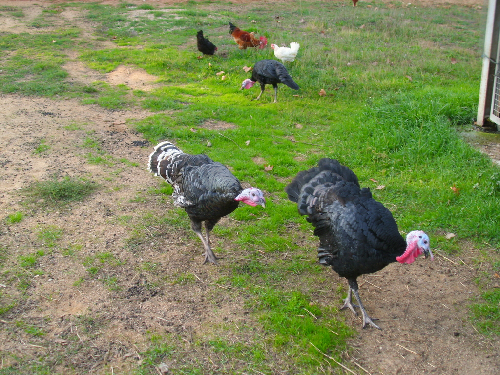 2013: pavos negros, gallo Prat, gallina negra francesa y gallina Leghorn (blanca), picando delante del corral 1024x768, 869.7 KB |