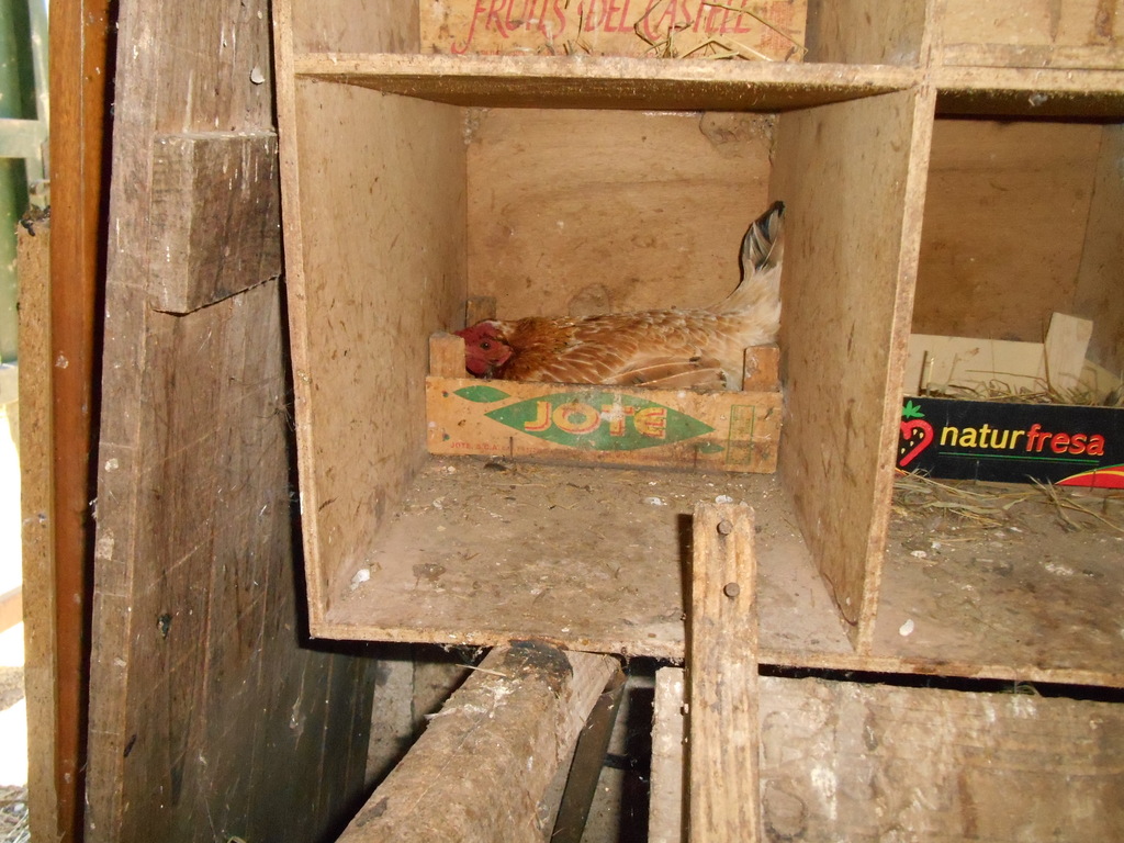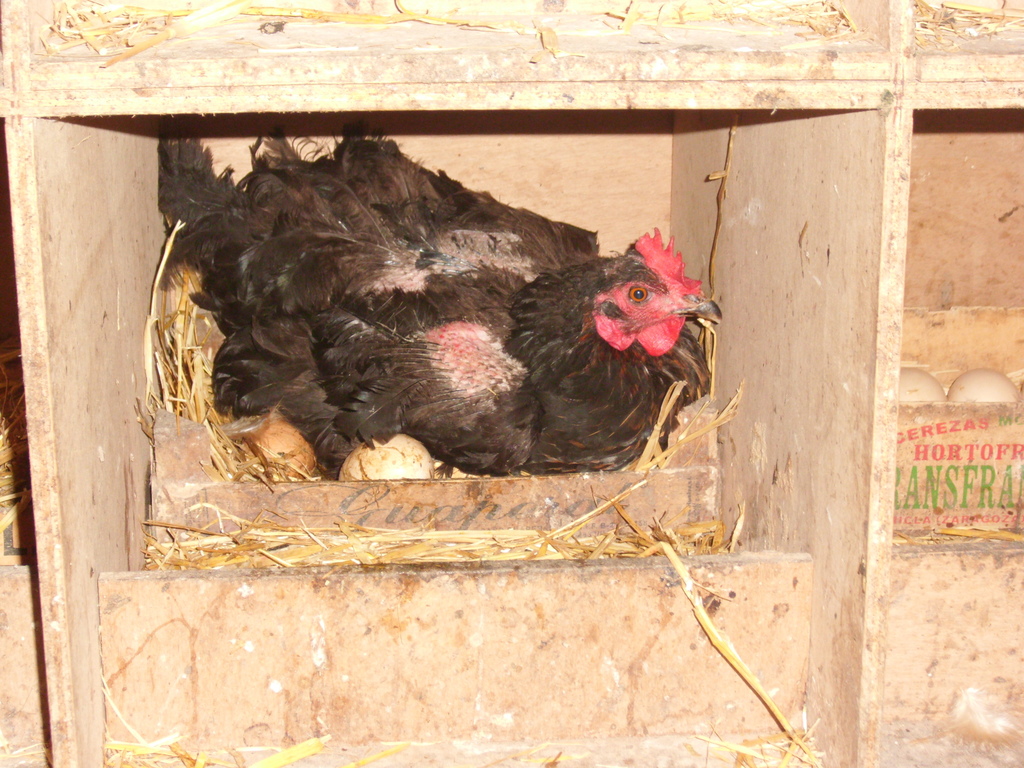 Gallina empollando: cuando están cluecas, se aplastan sobre los huevos, par adarles calor. Las tranquilas se dejan tocar ellas y los huevos. Algunas ni se mueven, otras te pican la mano y las nervisosas, no lo toleran y salen volando. A veces distintas gallinas escogen el mismo nidal para poner huevos y/o empollar. Este caso complica la recogida de los huevos, que se debe hacer sin guantes, ya que si no lo hacemos cada día, tendremos que reconocer cuáles son del día y cuales incubados y/o de días anteriores. En gallineros comerciales se hacen 3 recogidas manuales de huevos al día (mañana, mediodía y tarde). En nuestro caso, se realiza una a final de la mañana y se recogen solo los huevos que están calientes y que son del día, que se deben diferenciar del resto. La identificación de los huevos del día se basa en la sensación manual de su Tª (acaba de ser puesto), que depende de la temperatura ambiental (invierno-verano), de la Tª de los otros huevos (Tª -externa- de incubación en el nido) y del aspecto de la cáscara (los huevos en incubación son de aspecto brillante, por el roce con las plumas al ponerse la gallina encima y al ser girados por la gallina; los acabados de poner se ven con aspecto mate). También se pueden marcar o numerar, a lápiz 1024x768, 329.4 KB |