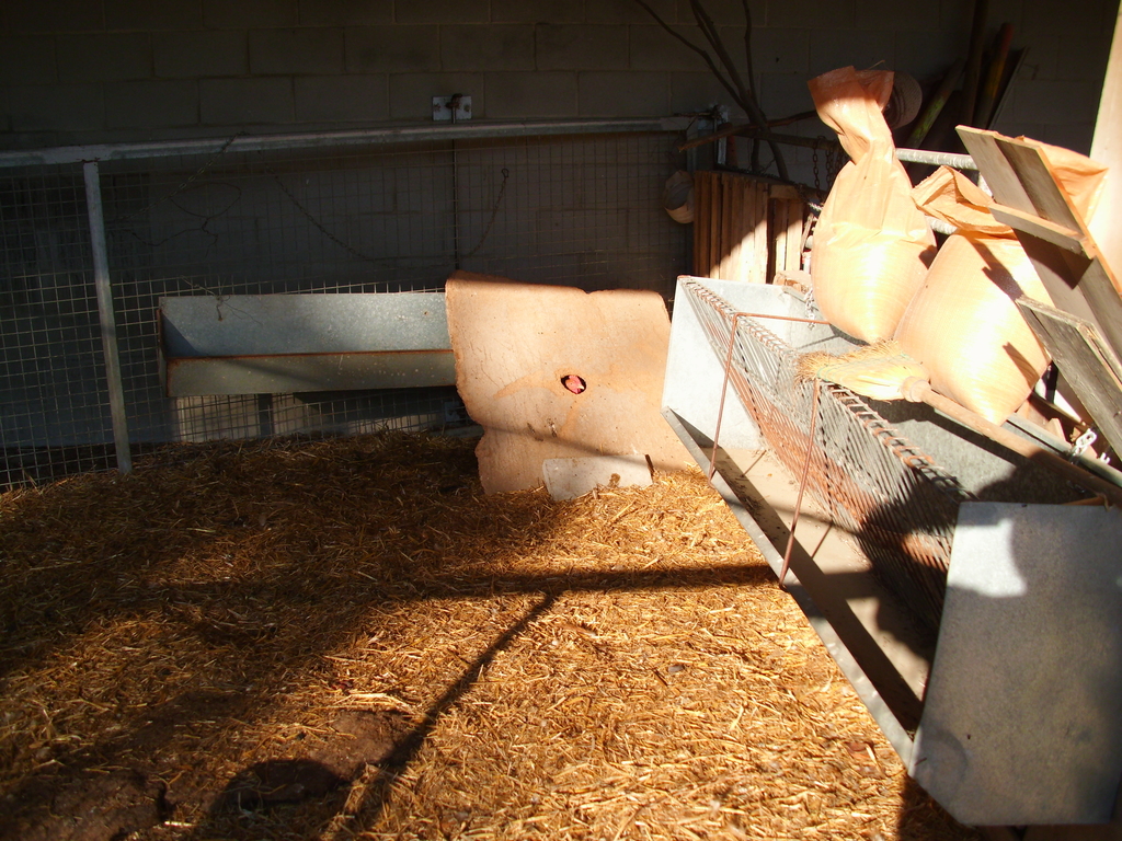 Si no hacemos cría y compramos un lote para engorde, los pollitos deben estar ya emplumados, si no tenemos instalación de luz o calefactora (es un posible peligro de incendio). Una antigua corralina de oveja se ha acondicionado como criadero de pollos, en el interior del gallinero. Dispone de paja, agua y pienso. La malla verde y los ladrillos cierran el espacio. ¡Hay que vigilar con las ratas! En la parte inferior izquierda de la puerta, se ha preparado una entrada excluidora, para que si no se hace una jaula cerrada, puedan salir y entrar a comer pienso solo los pollos. Por su tamaño, las gallinas pericas también pueden entrar 1024x768, 343.2 KB |
