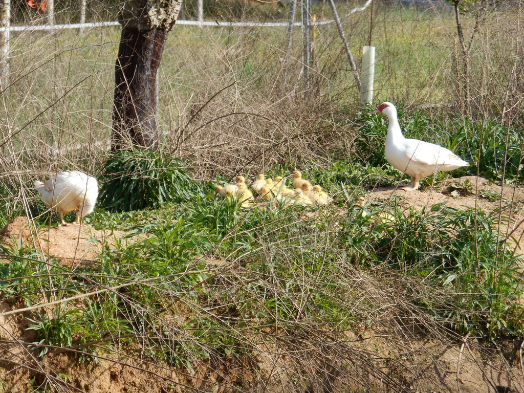 Pareja de raza Penedès y trio de patos mudos. La cría de patitos de este año fue excepcional: 2 y 3 empolles, respectivamente, con 8-12 pollitos cada uno, que se vendieron a los 15 días, a un payés para cría y cebo. Para cogerlos, la madre los defiende mucho; hay que engañarlos con comida, para reducirlos o instalar como una "manga de manejo"-trampa (sin salida). No obstante, durante el invierno atacó el ratonero y el trío quedó diezmado... 1024x768, 354.2 KB |