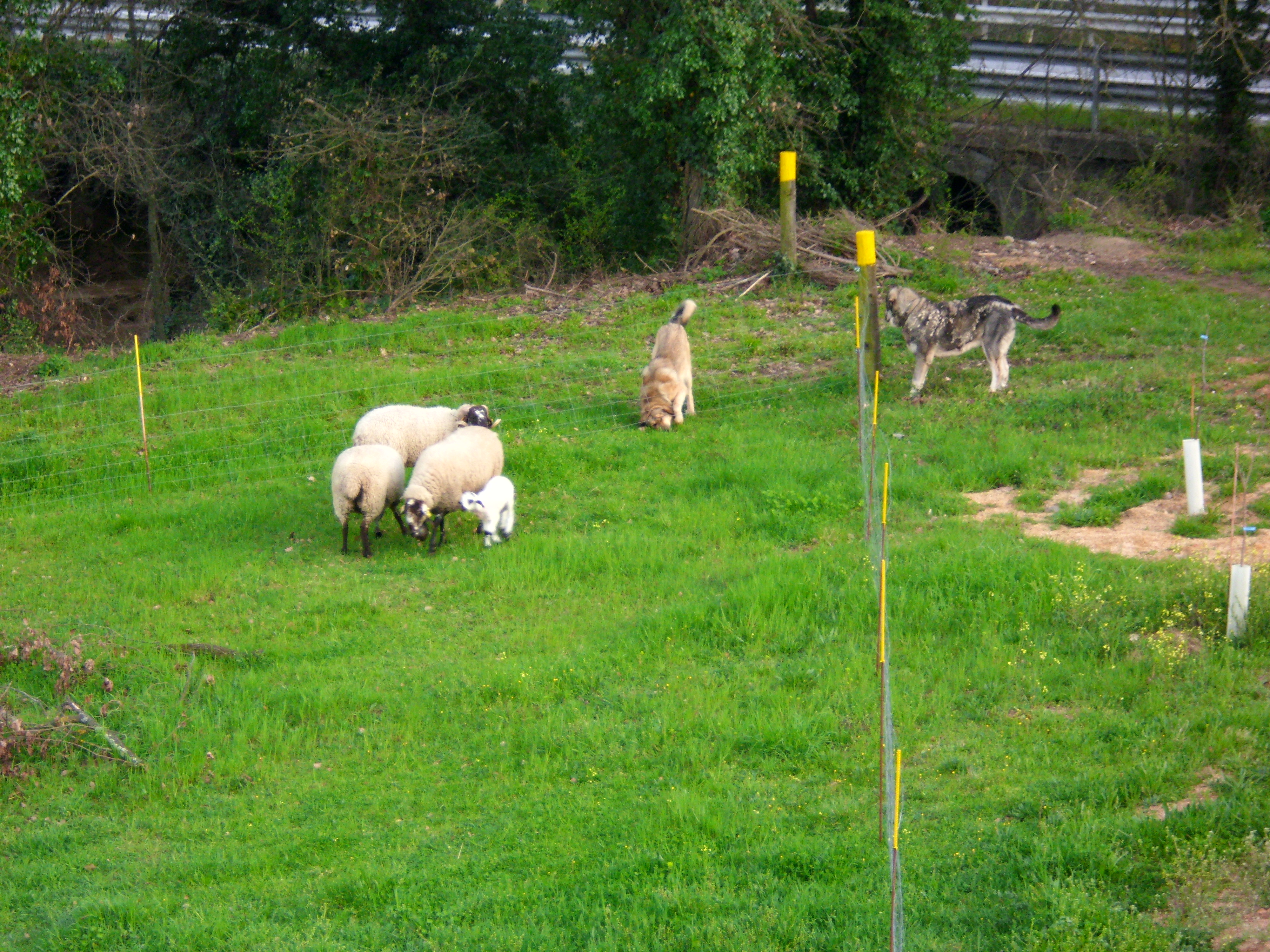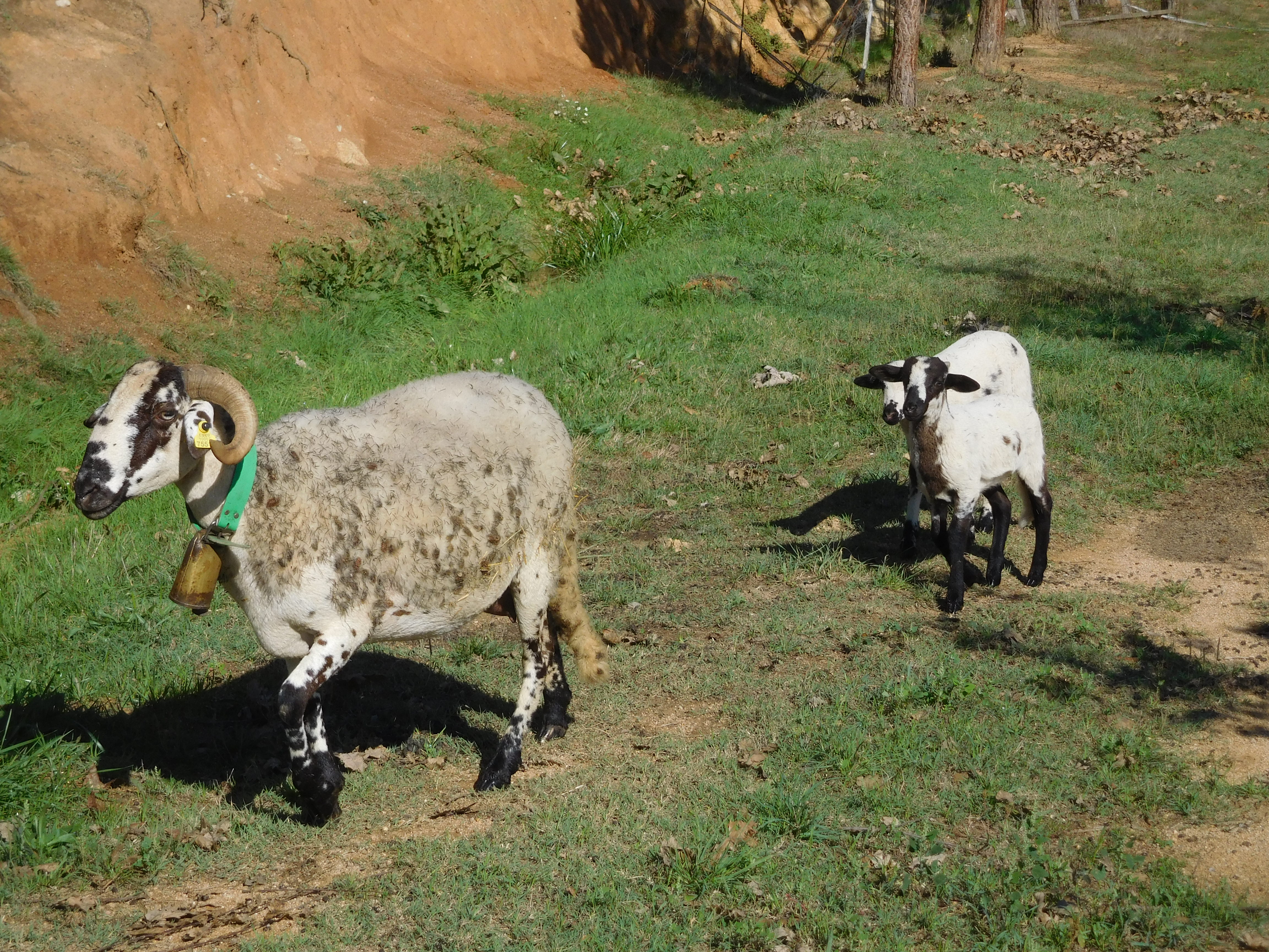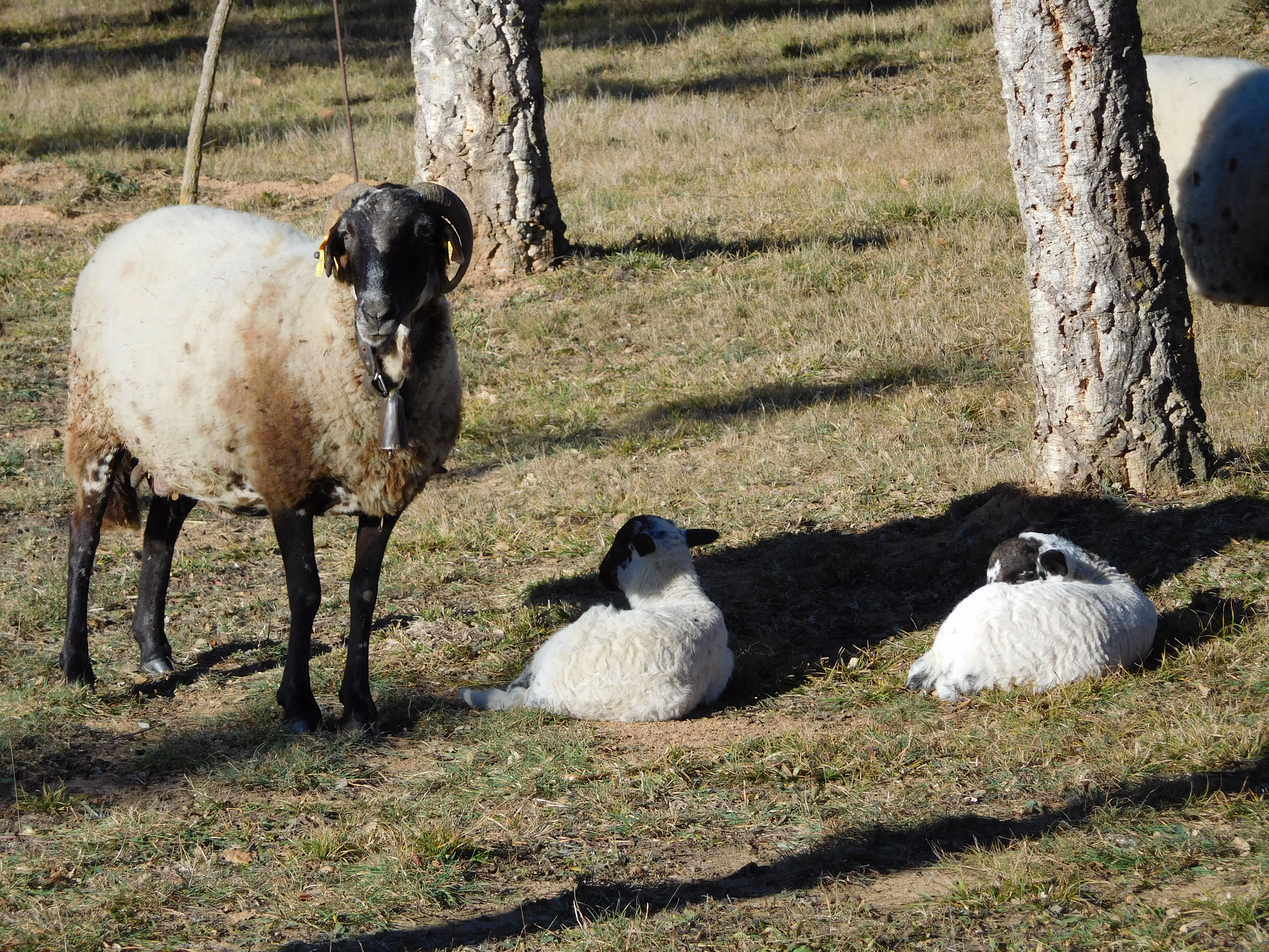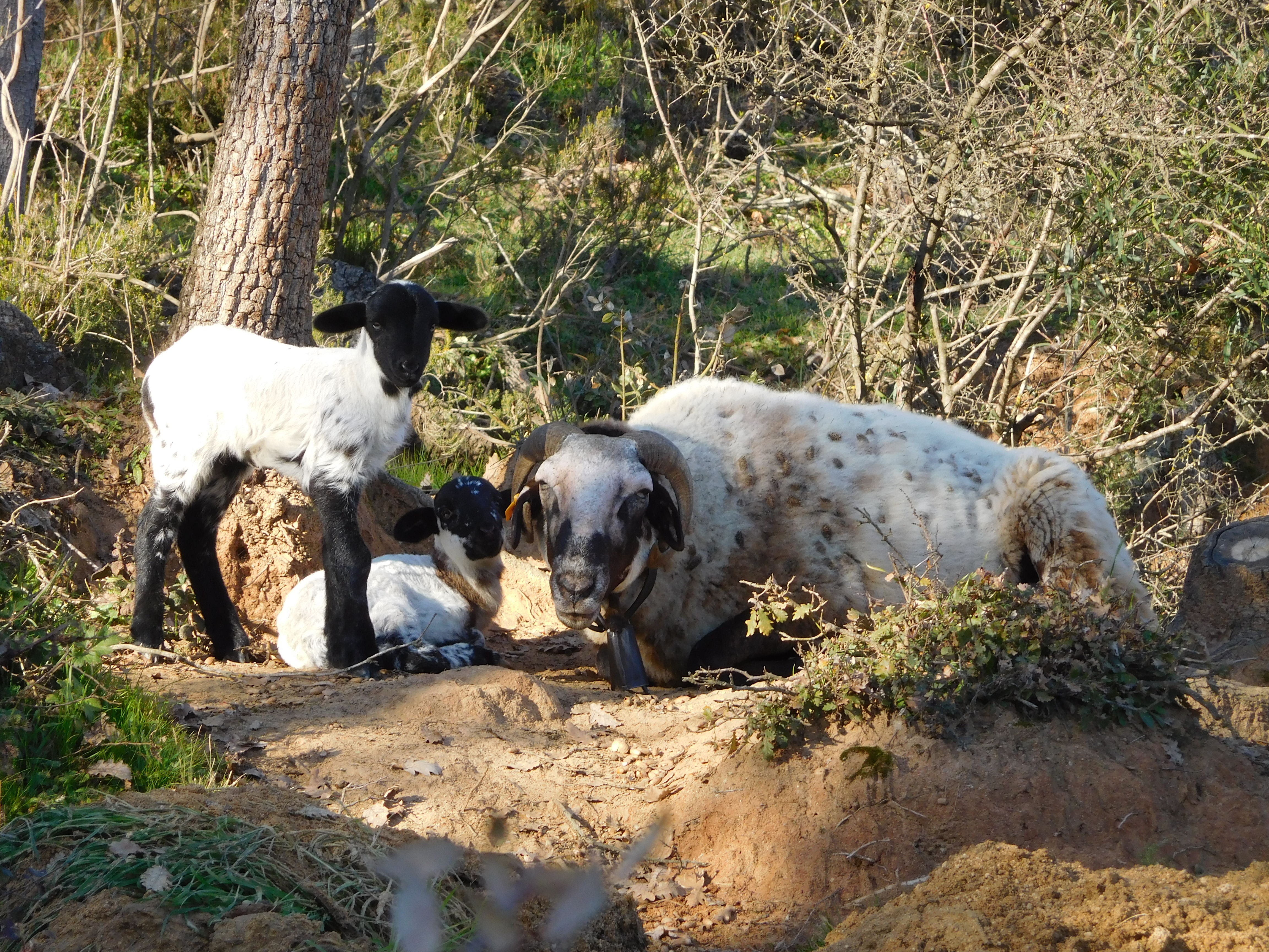 Núcleo inicial (un trío) de raza Ripollesa mejorada-Royo (la oveja de cara blanca es de parto doble y triple). Al fondo la cerda de cría en el vallado eléctrico del bosque 3584x2372, 4.3 MB |