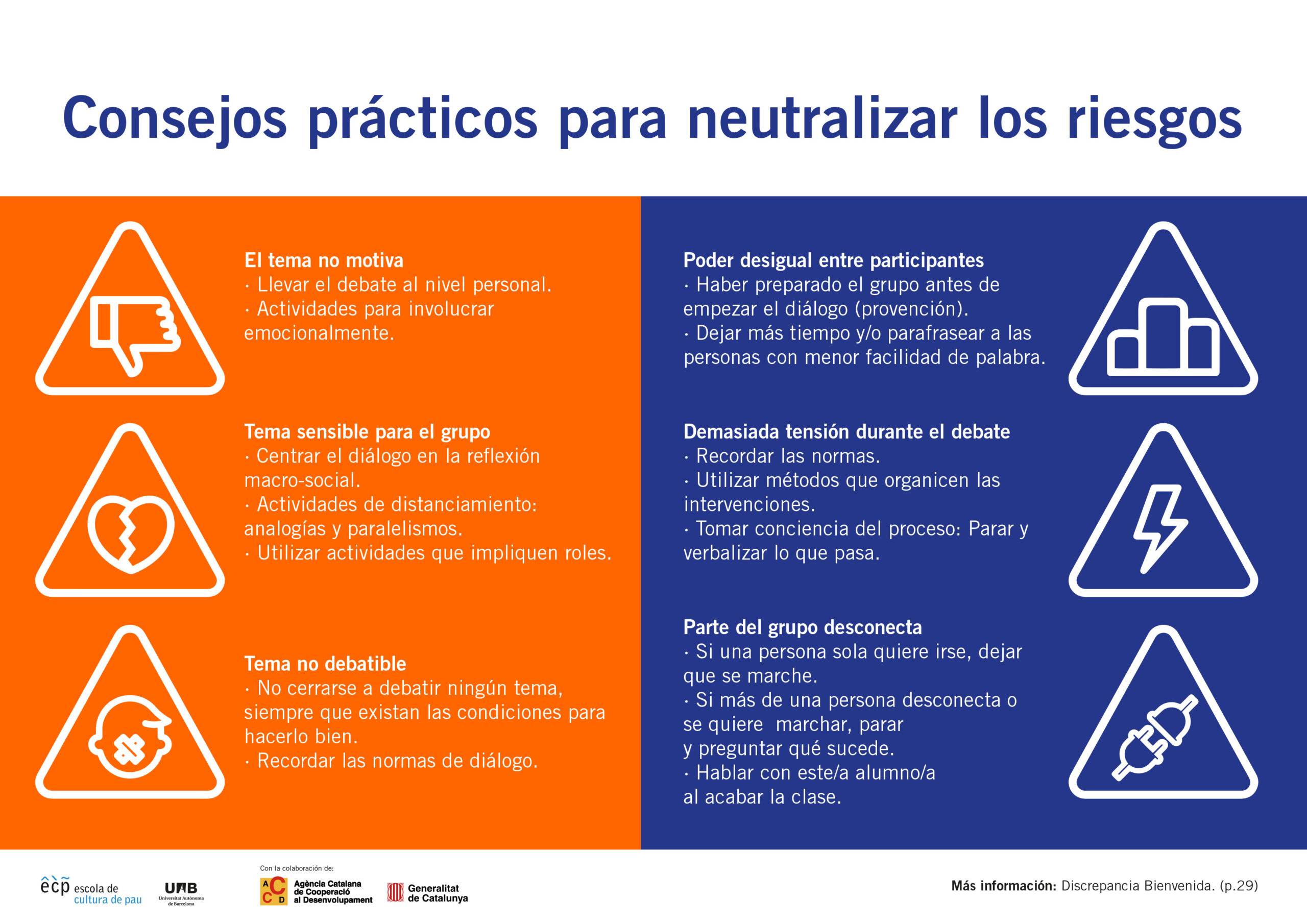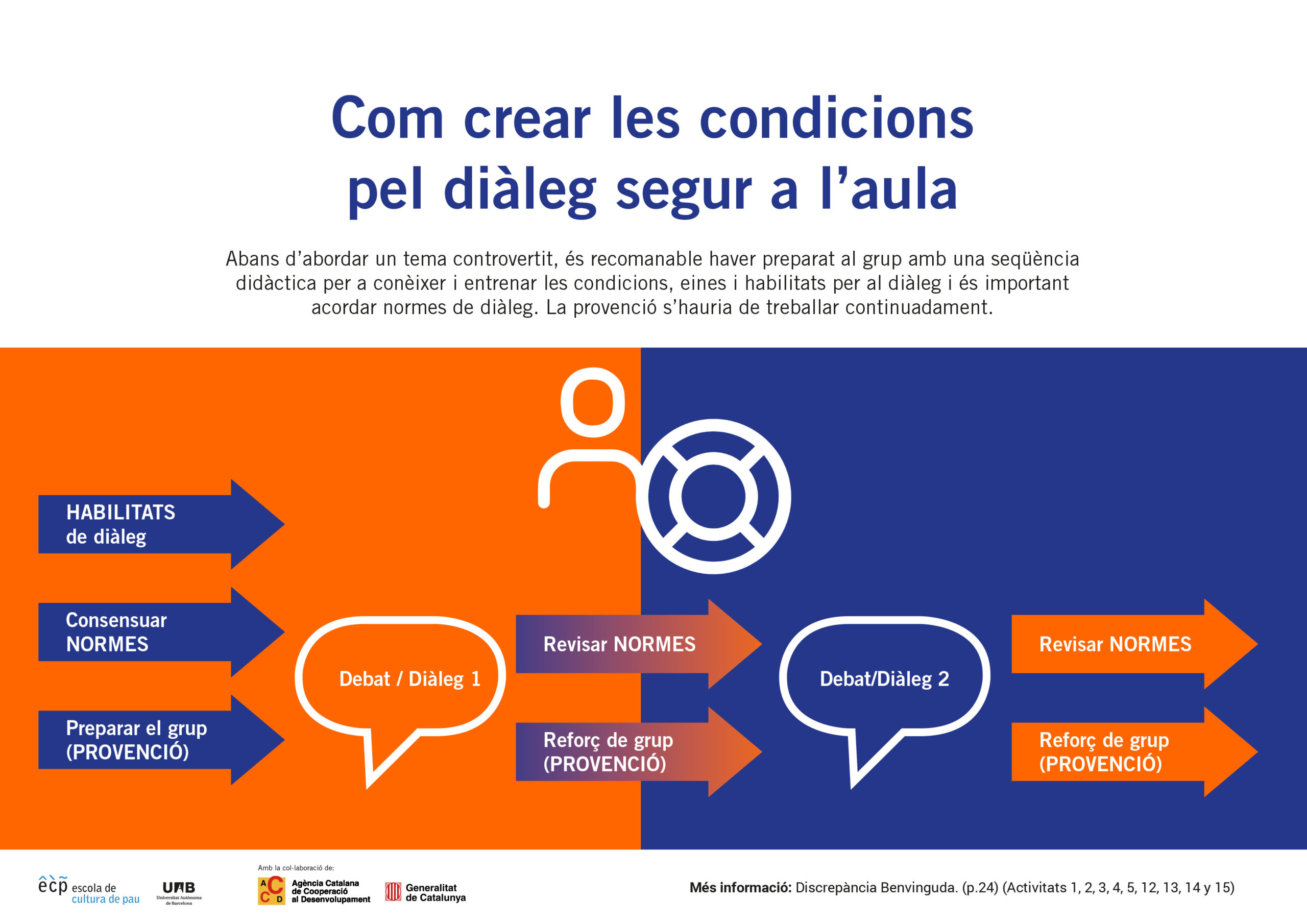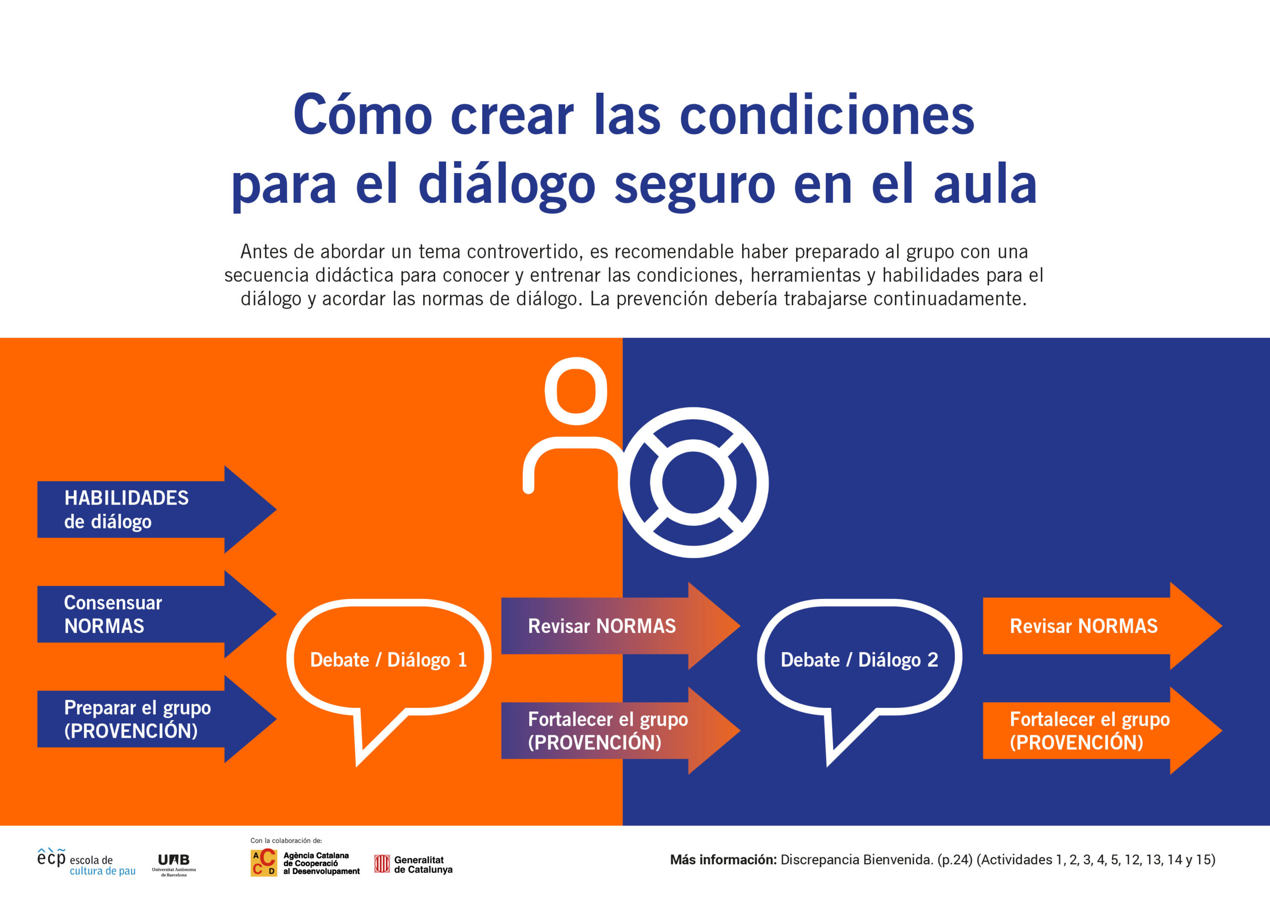 Resum: La guia té com a objectiu principal aportar eines al professorat per animar-lo a dinamitzar diàlegs controvertits a l'aula. Neix de la necessitat de conviure amb la diversitat de persones, col·lectius i punts de vista que conformen la societat contemporània. S'acompanya d'infografies amb els principals conceptes.