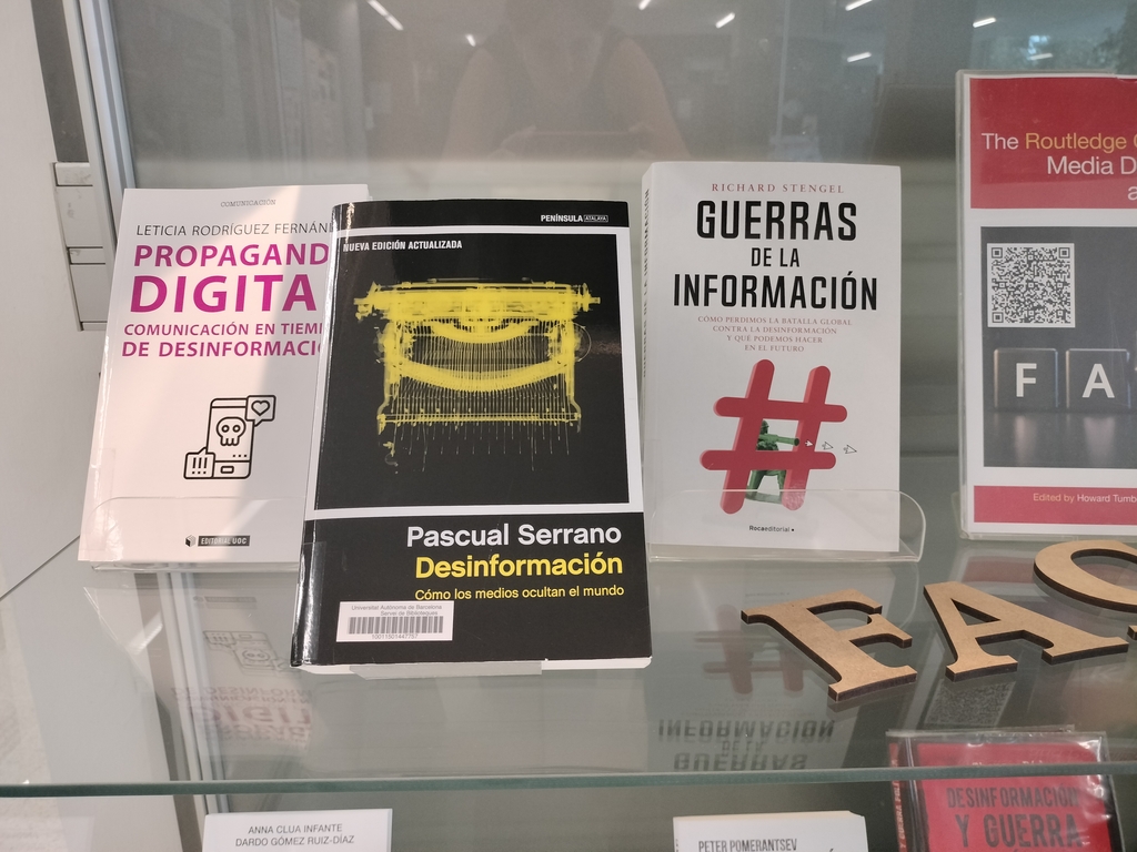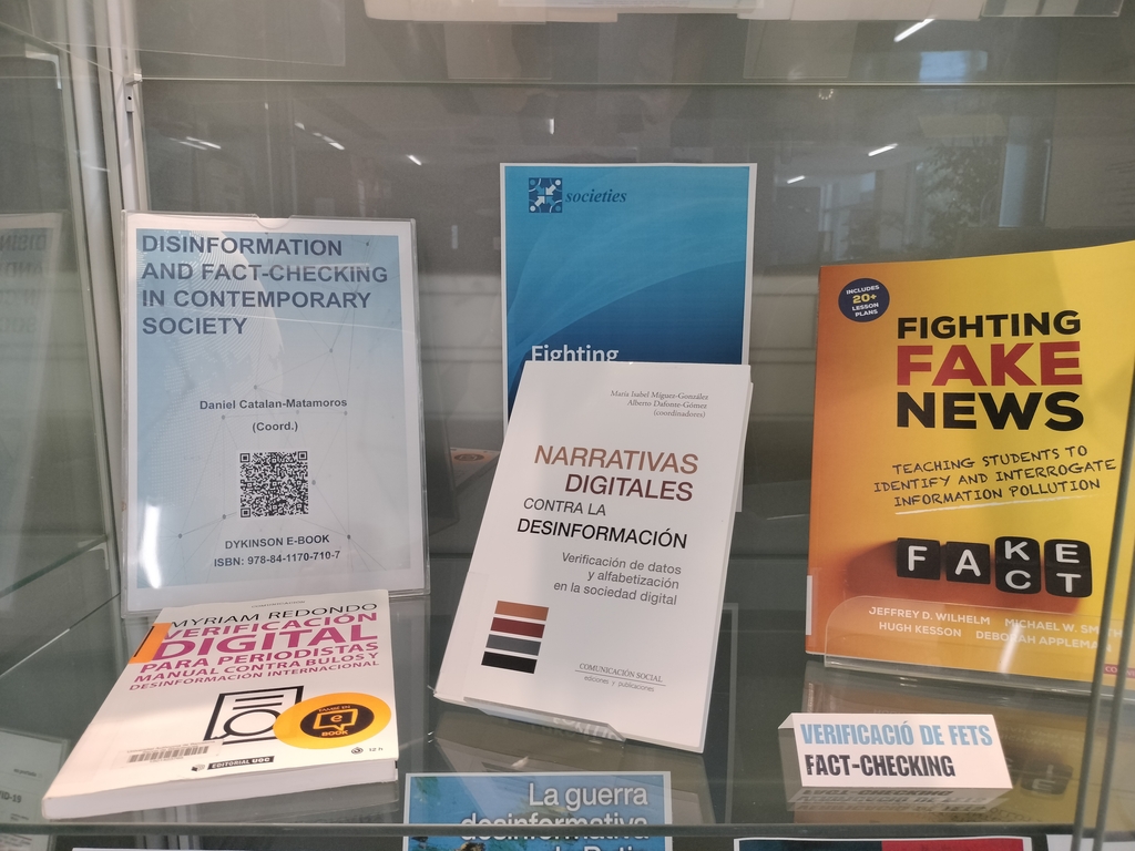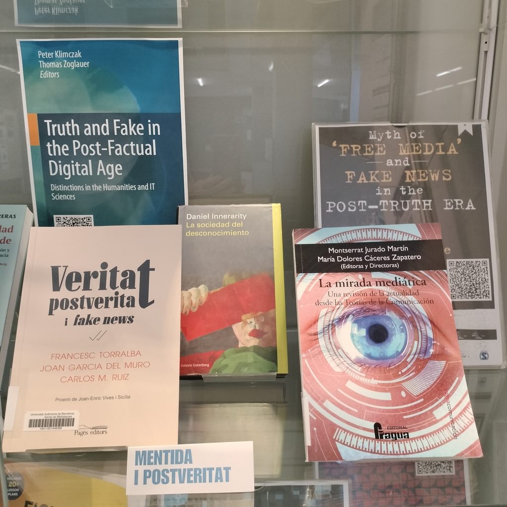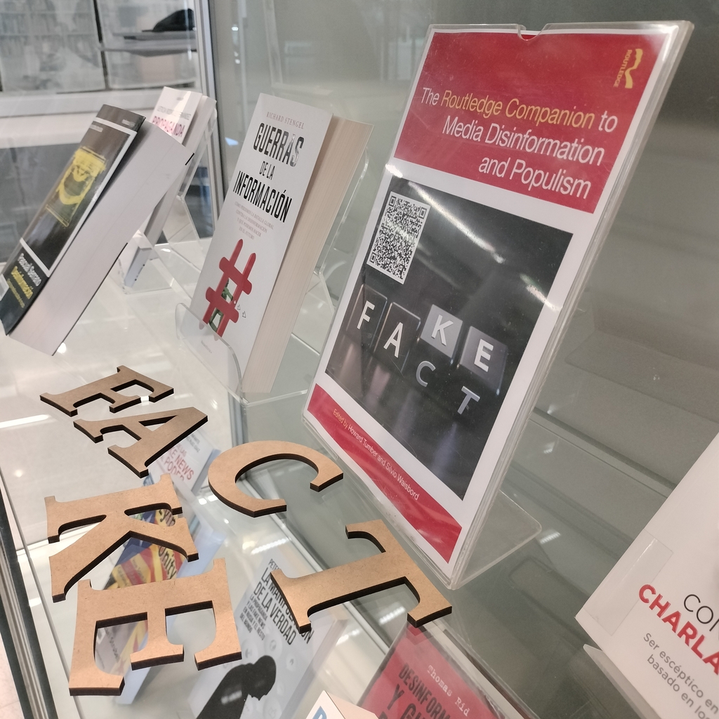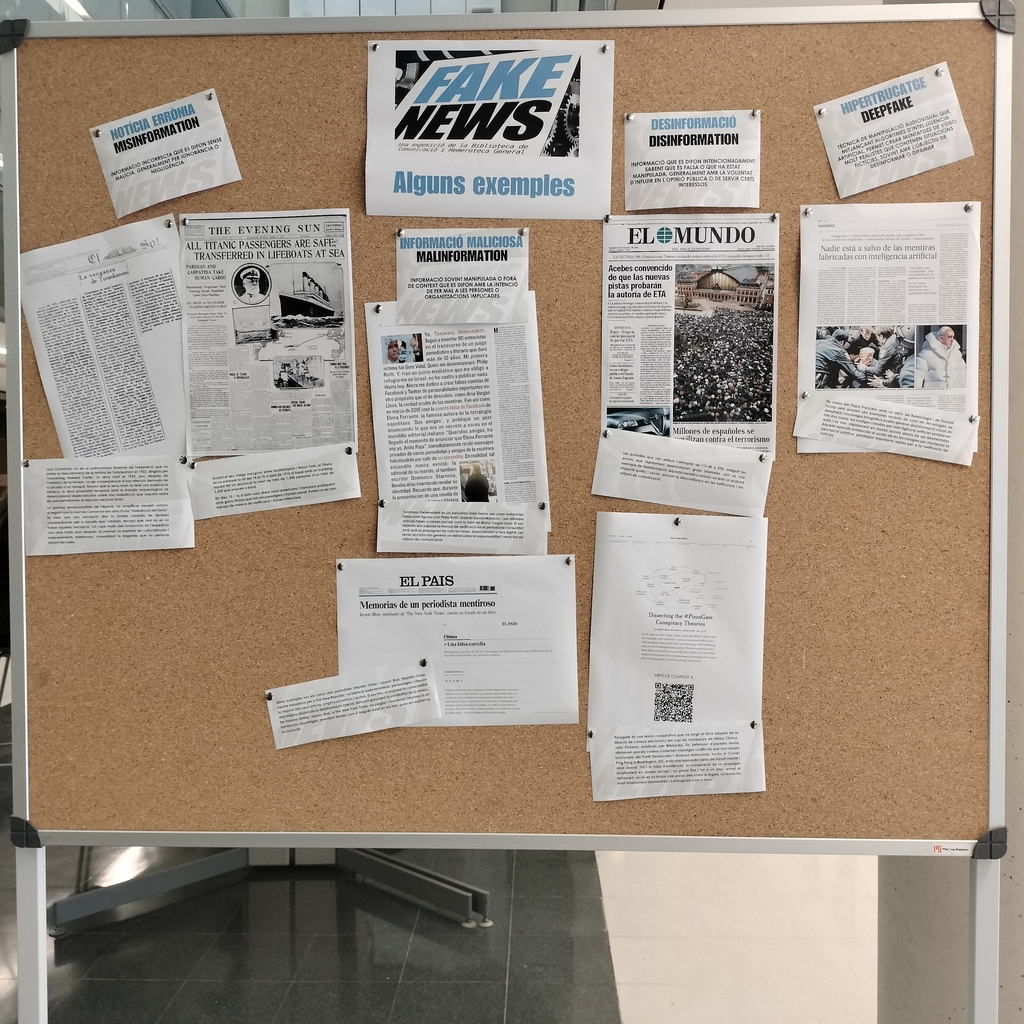 Resum: Exposició presencial de la Biblioteca de Comunicació i Hemeroteca General on es mostren documents sobre les notícies falses i temes relacionats com ara la desinformació, la verificació de notícies i el paper dels periodistes.