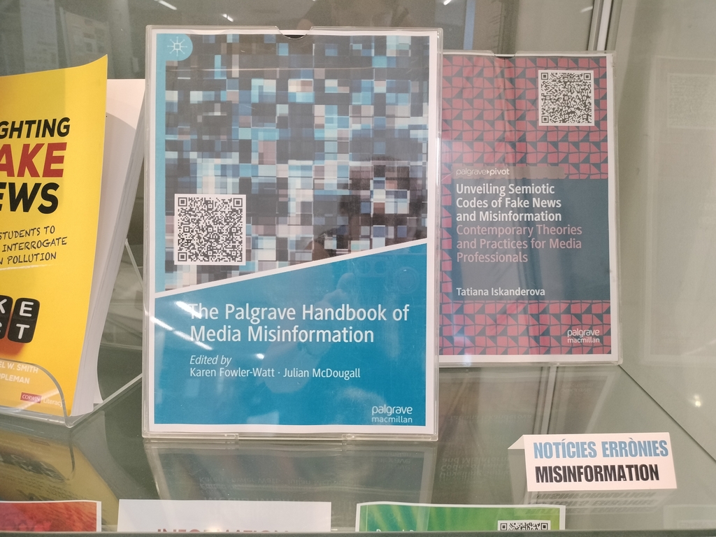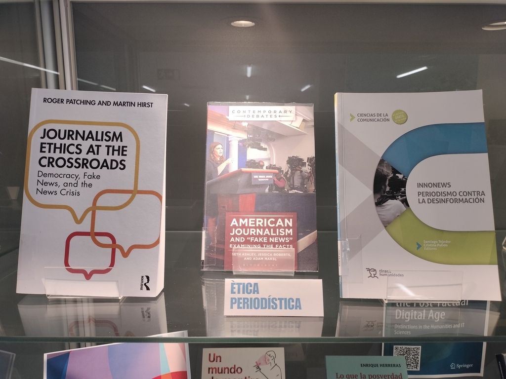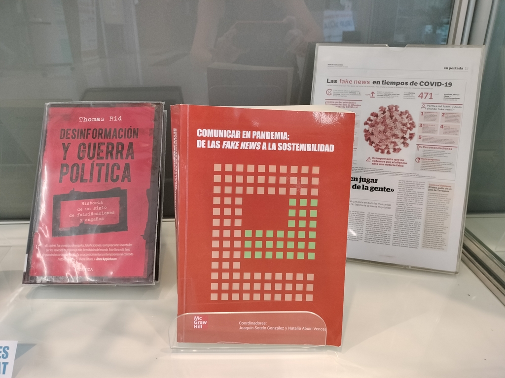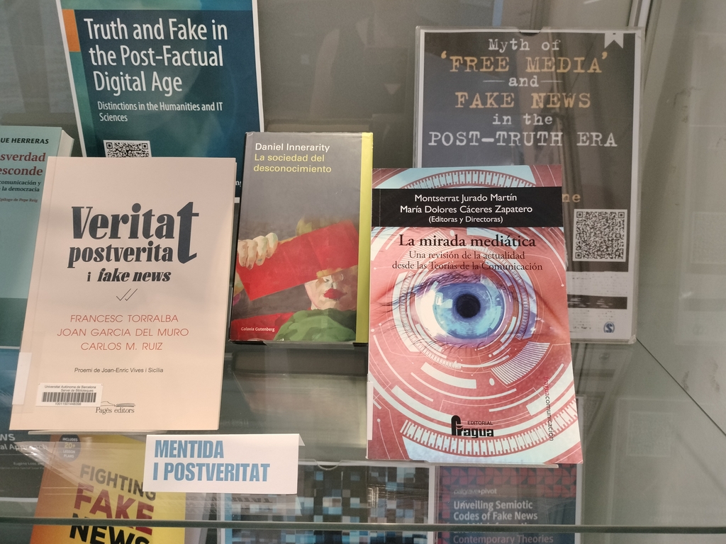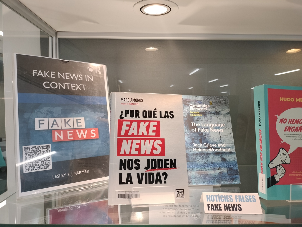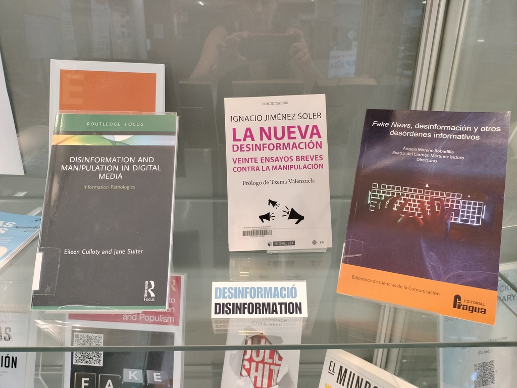 Resum: Exposició presencial de la Biblioteca de Comunicació i Hemeroteca General on es mostren documents sobre les notícies falses i temes relacionats com ara la desinformació, la verificació de notícies i el paper dels periodistes.