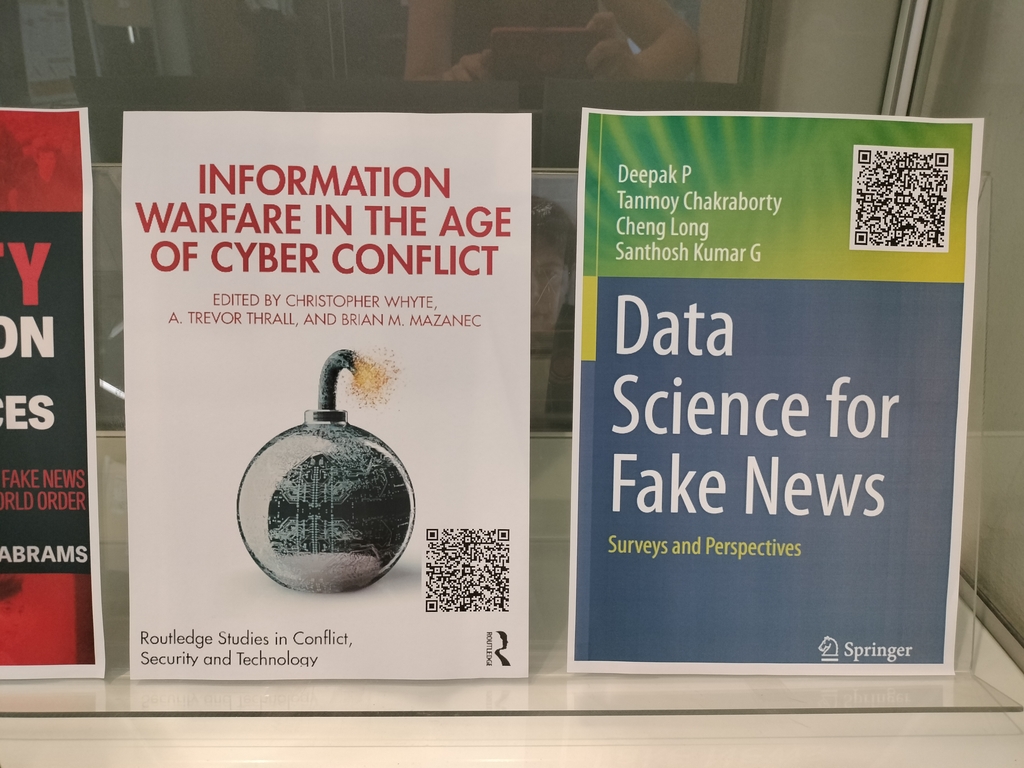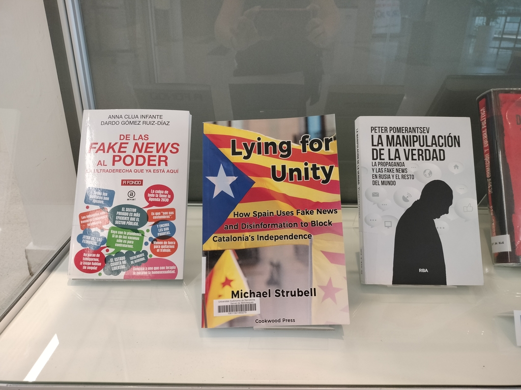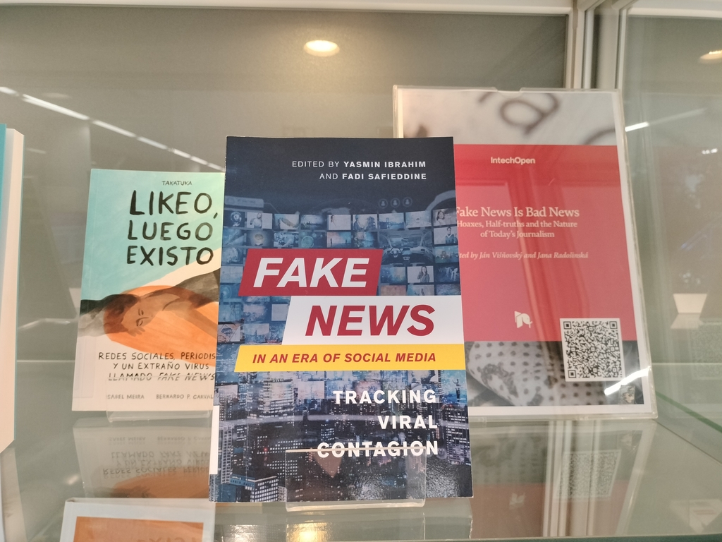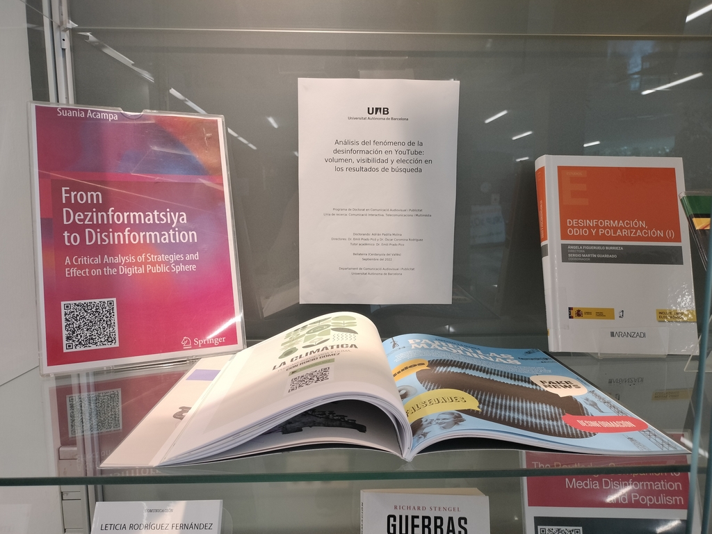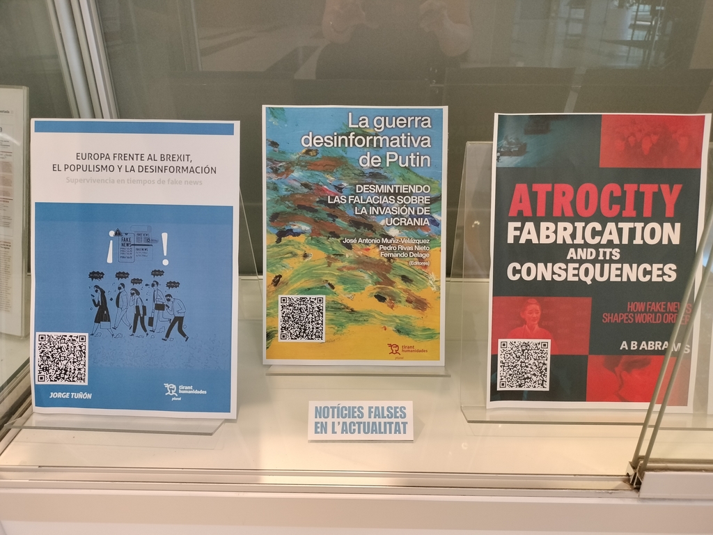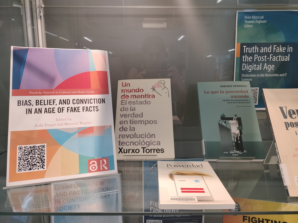 Resum: Exposició presencial de la Biblioteca de Comunicació i Hemeroteca General on es mostren documents sobre les notícies falses i temes relacionats com ara la desinformació, la verificació de notícies i el paper dels periodistes.