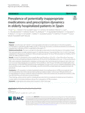 In recent years, the need for a more appropriate prescription of medications in the older population has emerged as a significant public health concern. In this study, we aimed to evaluate the prevalence of potentially inappropriate medications (PIM) in hospitalized adults aged ≥ 75. This was a retrospective descriptive observational study of patients at 16 hospitals in Spain. The study population included inpatients aged ≥ 75 admitted during a 7-day period (May 10 to 16, 2021). Data were obtained from the pharmacy databases of the participating hospitals. The list of PIMs was based on the Beers, STOPP-START, EU-PIM and PRISCUS criteria. A total of 4,183 patients were included. PIMs were detected in 23. 5% (N = 1,126) of the cohort. The prevalence rates at the participating hospitals ranged from 10% to 42. 5%. The PIM/patient ratio was 1. 2. The most common PIMs were midazolam, dexketoprofen, diazepam, and doxazosin, all of which (except for doxazosin) were more common in women. Benzodiazepines accounted for 70% of all PIMs. In 35% of cases, the PIMs were initiated before hospital admission. Of the 818 PIMs initiated during hospitalization, the two most common were benzodiazepines (49%) and anti-inflammatory drugs (25%). At discharge, only 4. 9% of the PIMs initiated during the hospital stay were still prescribed. In this population of older hospitalized patients, the overall prevalence of PIMs was moderate. However, the prevalence rate at the participating hospitals was highly variable. In most cases, PIMs prescribed prior to hospitalization for chronic conditions were not withdrawn during the hospital stay. No significant increase in PIMs was observed from pre-admission to post-discharge. These findings underscore the need for multidisciplinary interventions to optimize the pharmaceutical treatment in older adults in the hospital setting to reduce the consequences of PIMs in patients. The online version contains supplementary material available at 10. 1186/s12877-024-05308-3. |