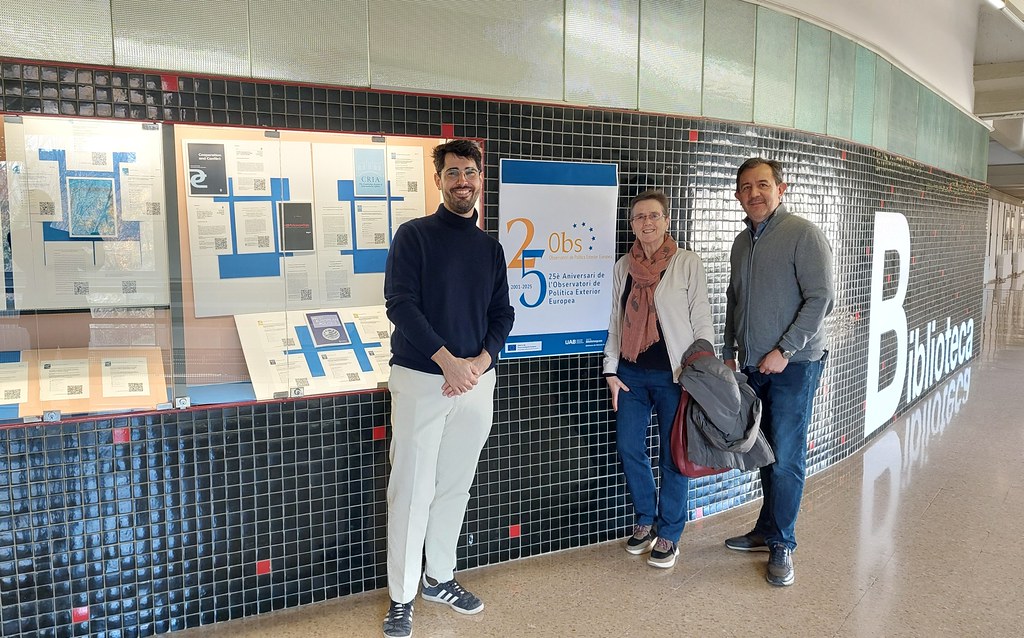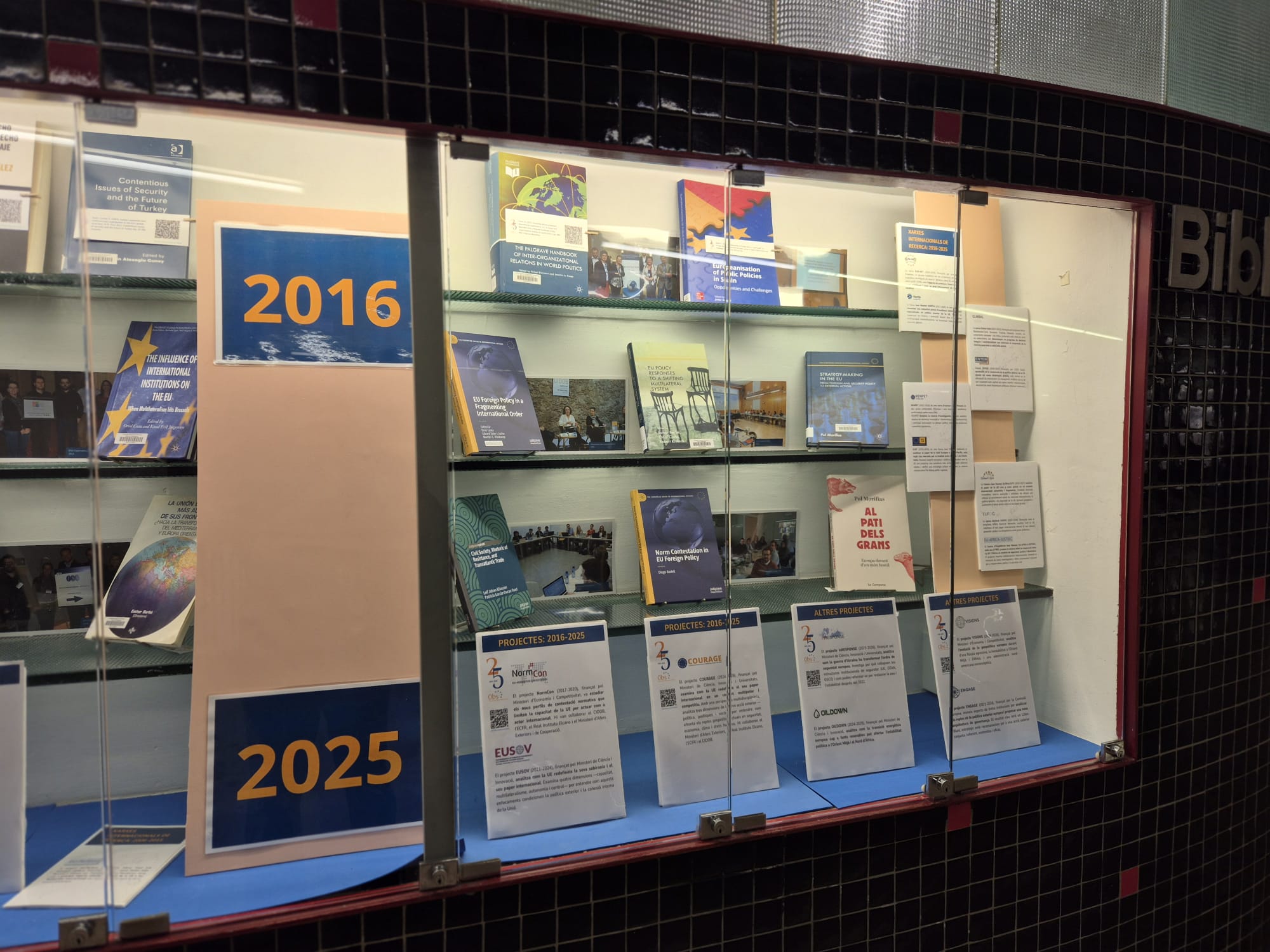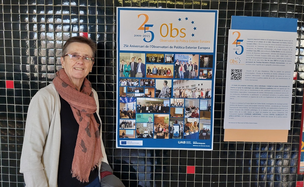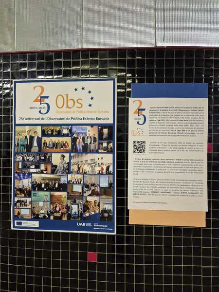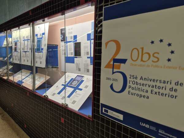 | Resum: | Mitjançant una selecció de publicacions, projectes i materials de recerca, la mostra repassa la trajectòria de l'Observatori -impulsat sota la direcció de la Dra. Esther Barbé- i posa en relleu la contribució de l' anomenada "Escola de Barcelona" a l'anàlisi de les relacions internacionals i dels estudis europeus. L'exposició presencial ha estat presentada a la Biblioteca de Ciències Socials del 2 de desembre de 2025 al 16 de gener de 2026 i ha estat organitzada amb la col. laboració del Centre de Documentació Europea i del mateix Observatori de Política Exterior Europea. Us convidem a visitar les fotografies de l'exposició presencial i a accedir a l'exposició virtual 25 anys de l'Observatori de Política Exterior Europea, disponible de manera indefinida en aquest web, per descobrir en profunditat la trajectòria i les aportacions de l'Observatori al llarg d'aquests 25 anys. |