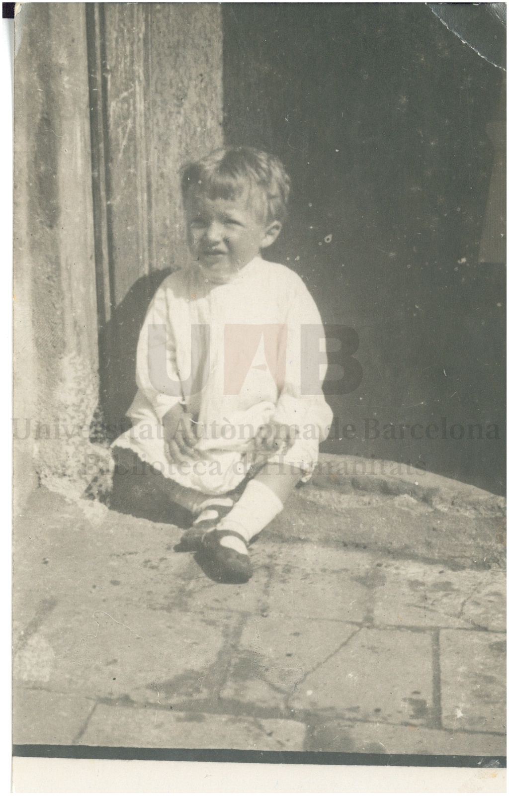 | Pàgina inicial > Documents gràfics i multimèdia > Fotografies > Fotografia de Pere Calders assegut a la porta d'una casa |