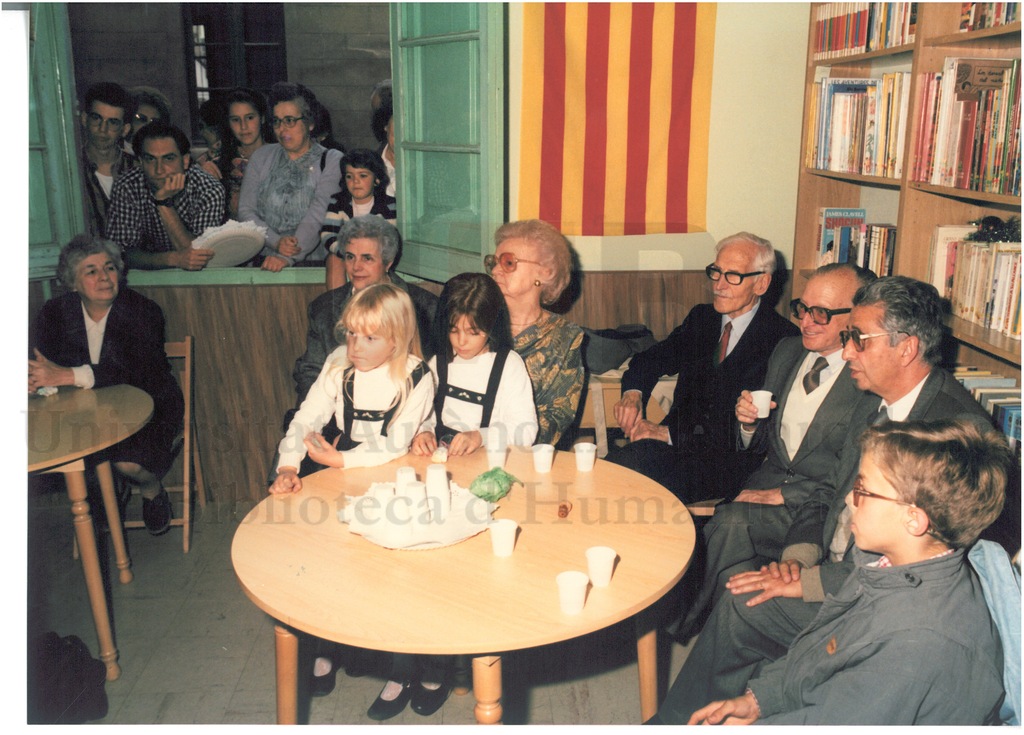 Asseguda a la taula de l'esquerra: Lluïsa Mercadet, A l'altra taula, a la falda de Rosa Artís: Gisela Coromines i Diana Coromines; Pere Calders i el nen Arcadi Marcet. |