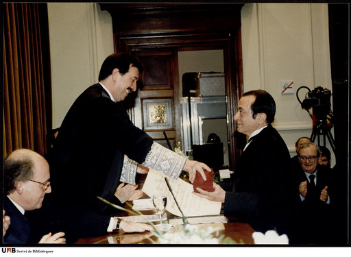 Fotografia de José Agustín Goytisolo rebent la medalla del Col·legi d'Advocats de mans d'Eugeni Gay