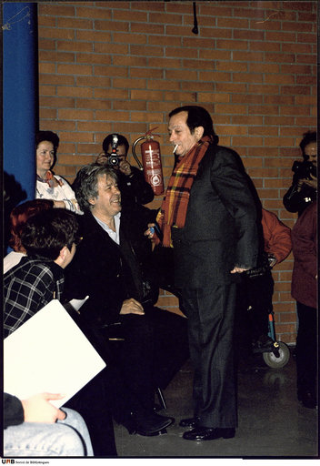 | Pàgina inicial > Documents gràfics i multimèdia > Fotografies > Fotografia de José Agustín Goytisolo acompanyat de Paco Ibáñez entre periodistes i curiosos a Nou Barris |
